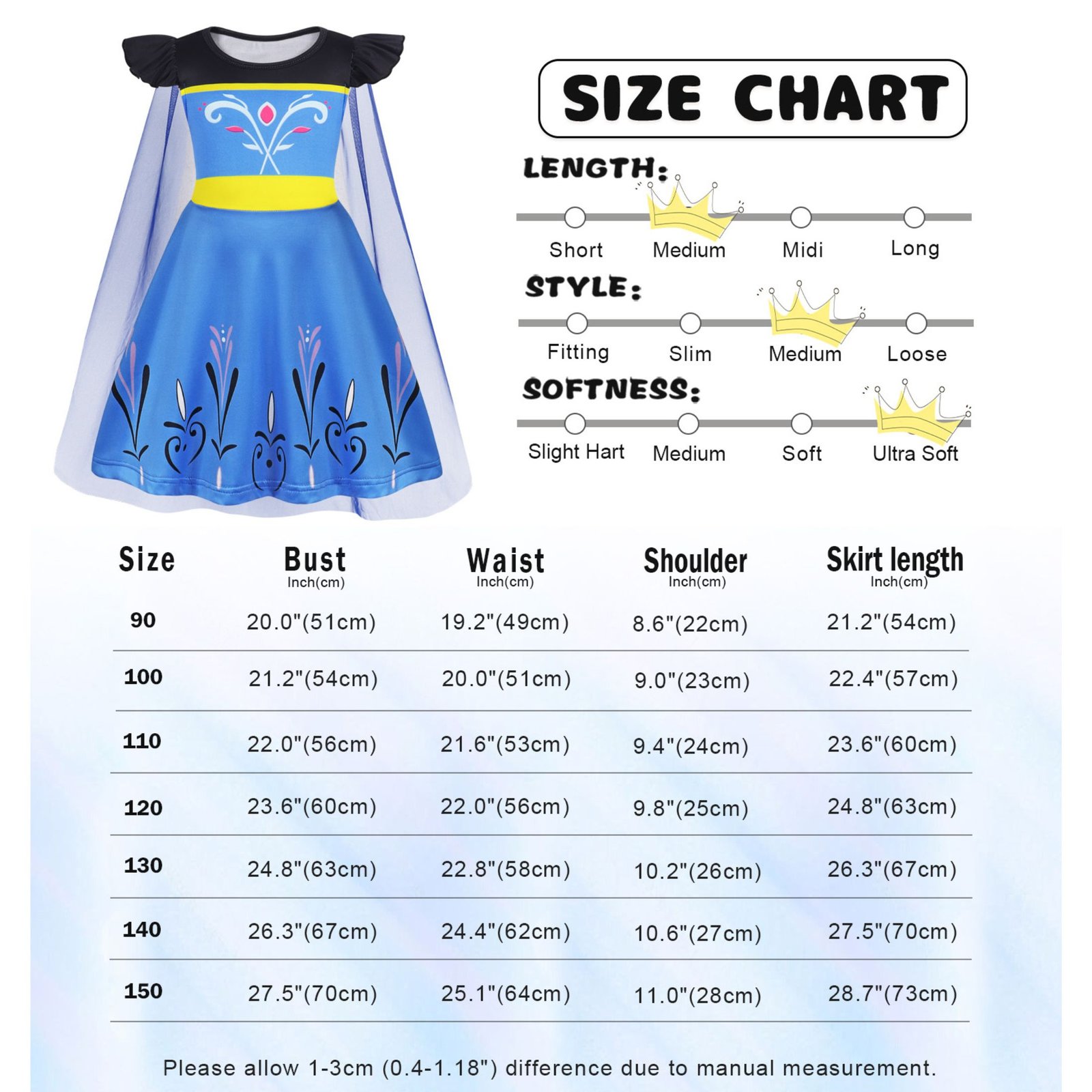 Benylion Girls Anna Princess Costume with Cape 3-4Y Blue Birthday Party Dress Halloween Cosplay Outfit