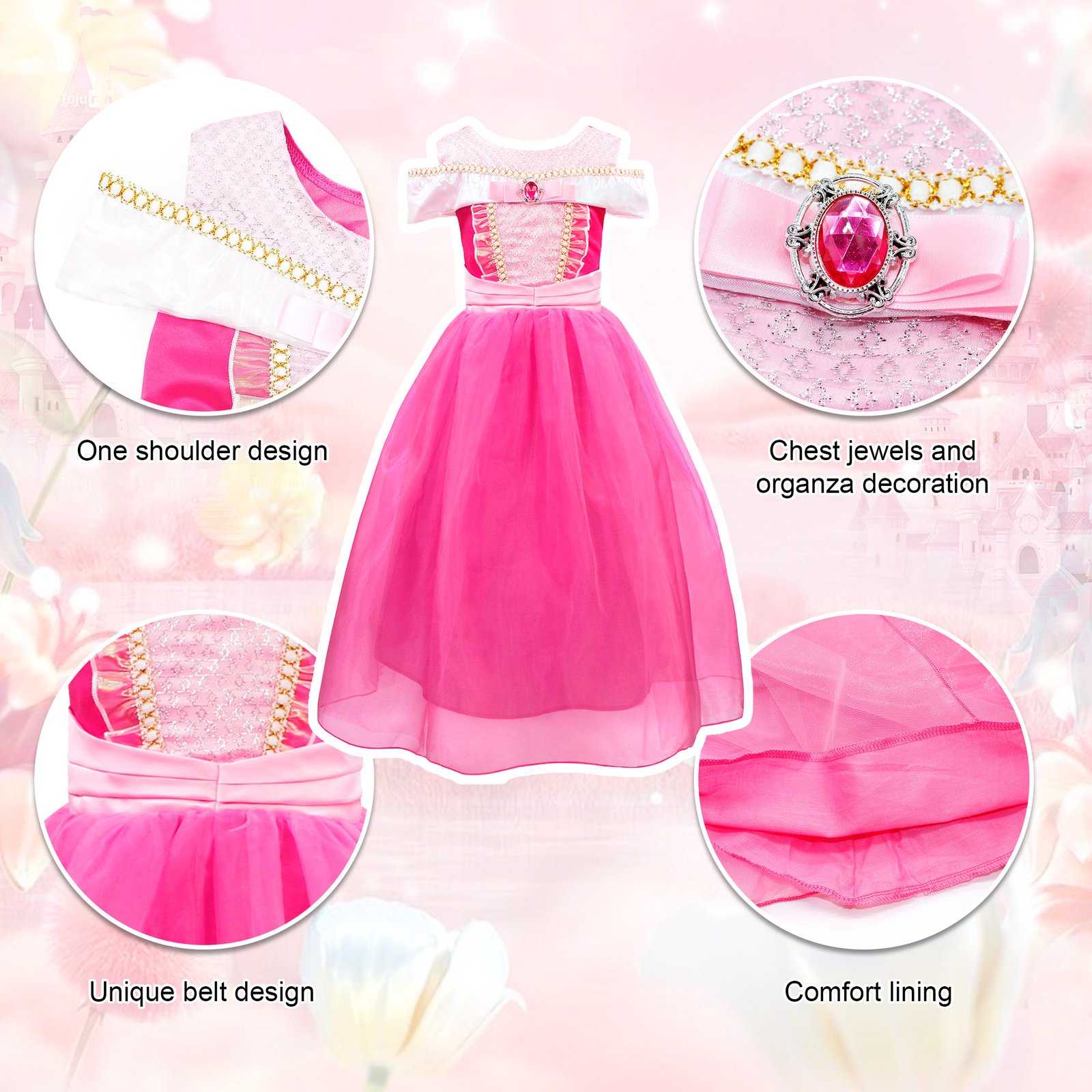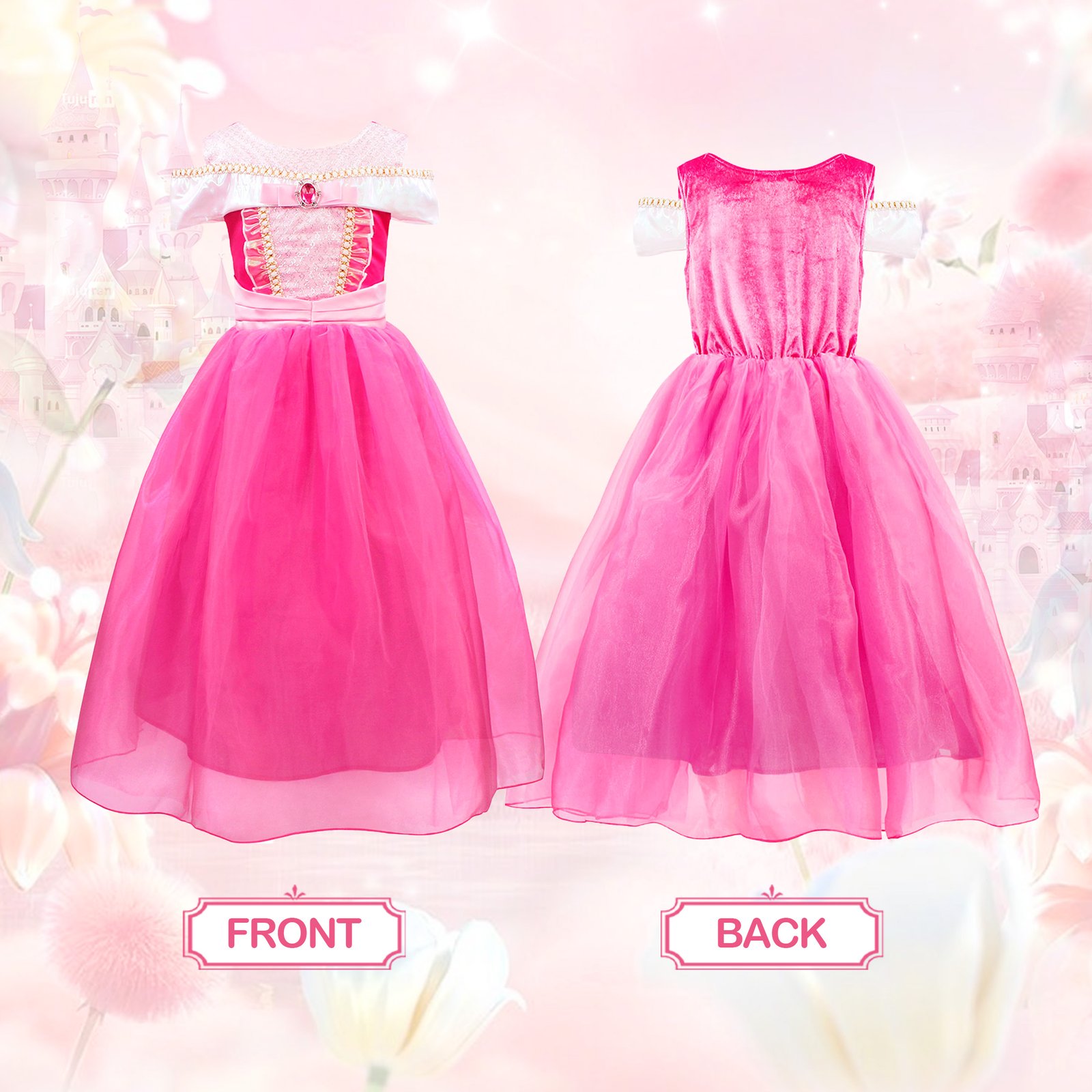 - Design: This beautiful Sleeping Beauty dress features an off-shoulder design, a floor-length ball-cut gown, a velvet corset, and a rhinestone inlaid in the middle, these clever designs reflect the elegance of the princess dress, allowing you to easily dress up your lovely girl as a princess.