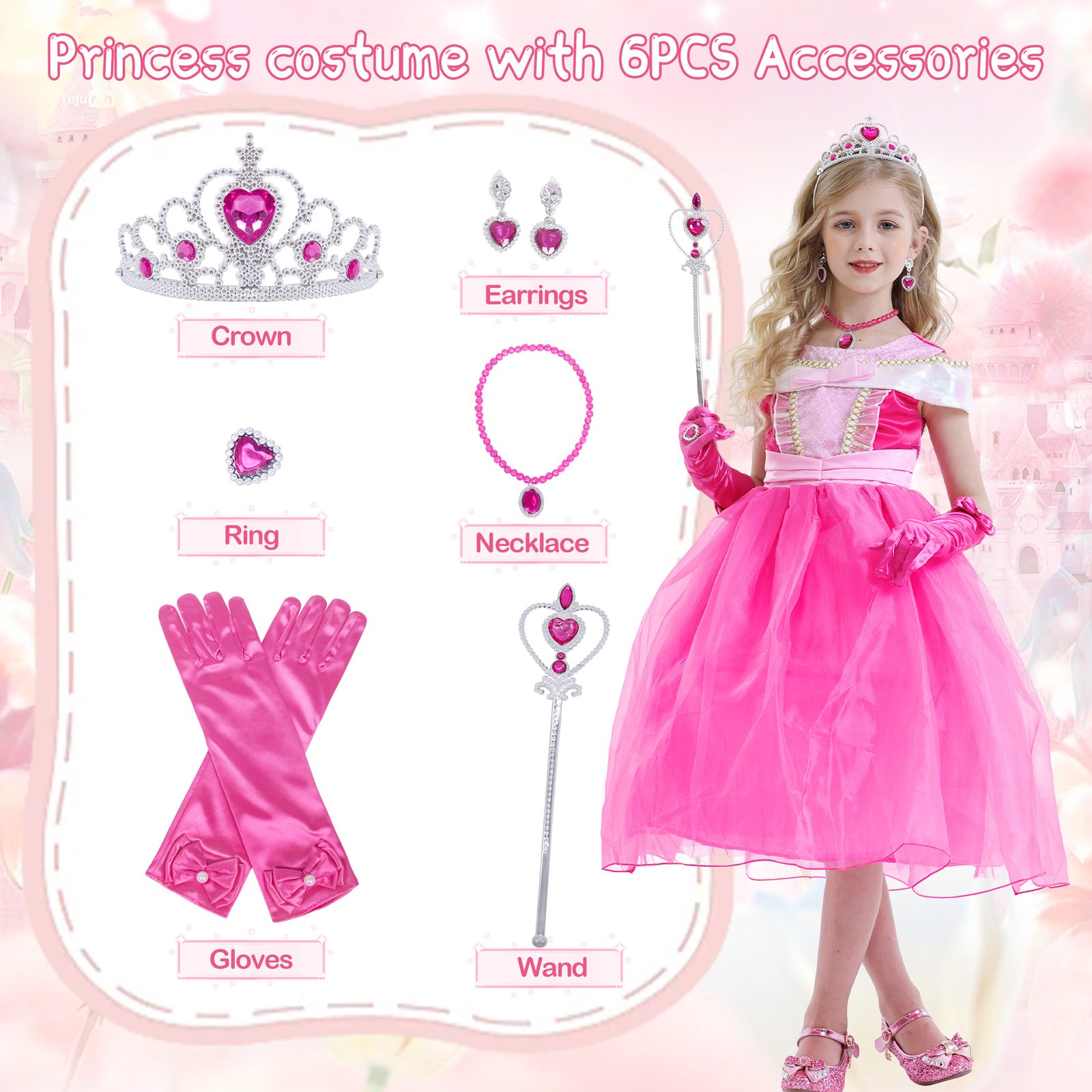 - Package: 1*girls Aurora princess dress, 1*necklace, 1*crown, 1*scepter, 1*ring, 1*earring, 1*glove; every girl likes it, suitable for princess dress up costumes.