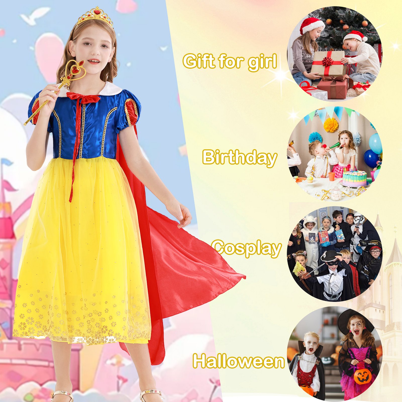 - Suitable for multiple occasions: this Snow White party dress is perfect for daily wear! This Snow White party dress is perfect for daily wear, birthday party, Christmas, Easter, carnival, dress up games, holiday dress up, Halloween, photography props, princess tea party, birthday dress up, stage performance, beauty pageant, role play. Bright design makes your child the center of attention, easy to create a sweet princess style look.