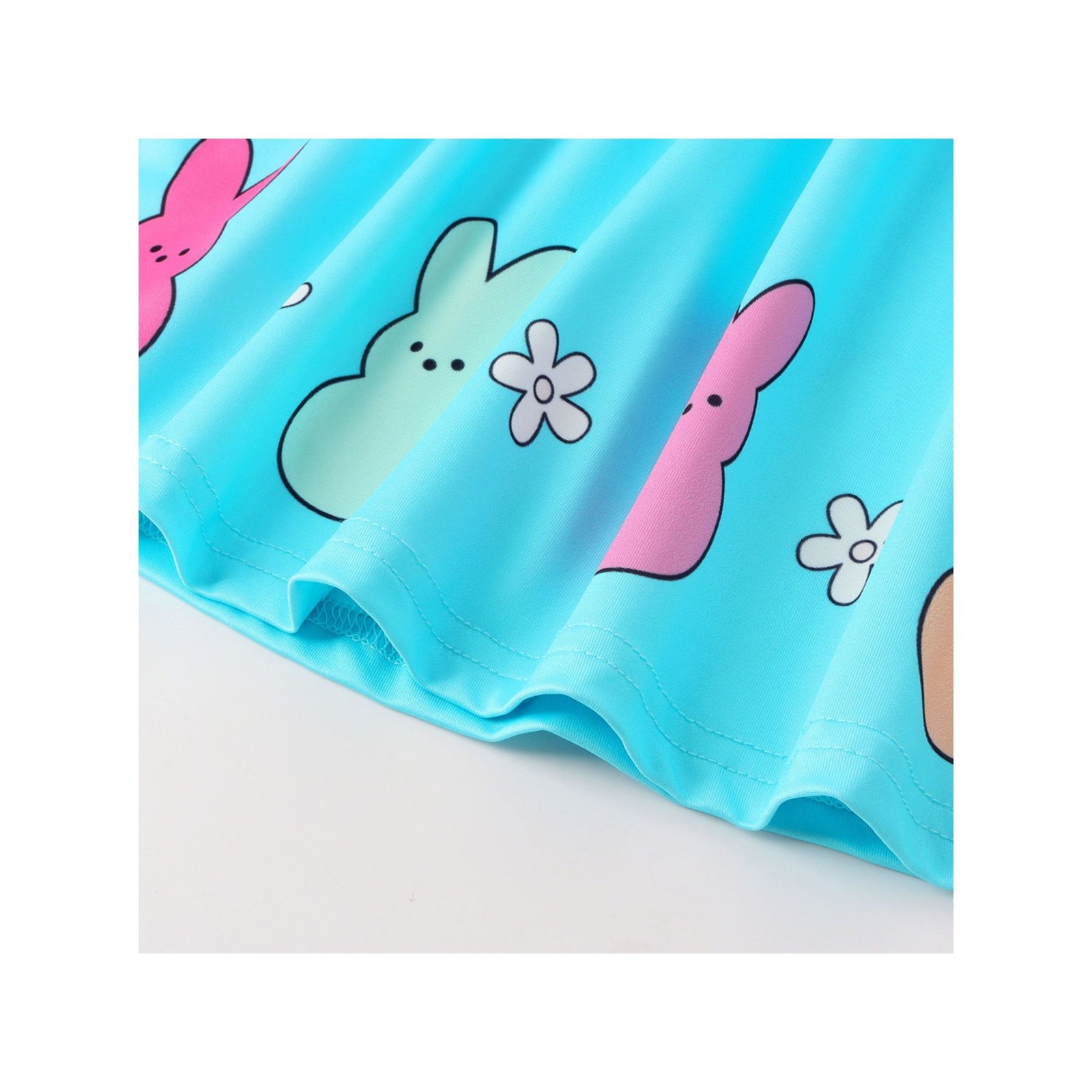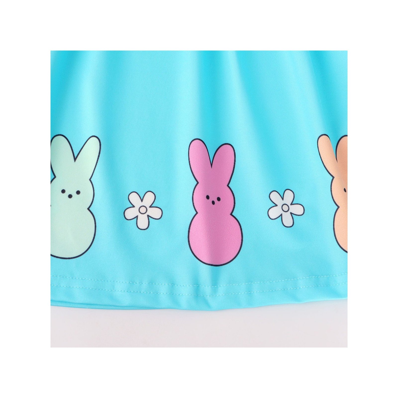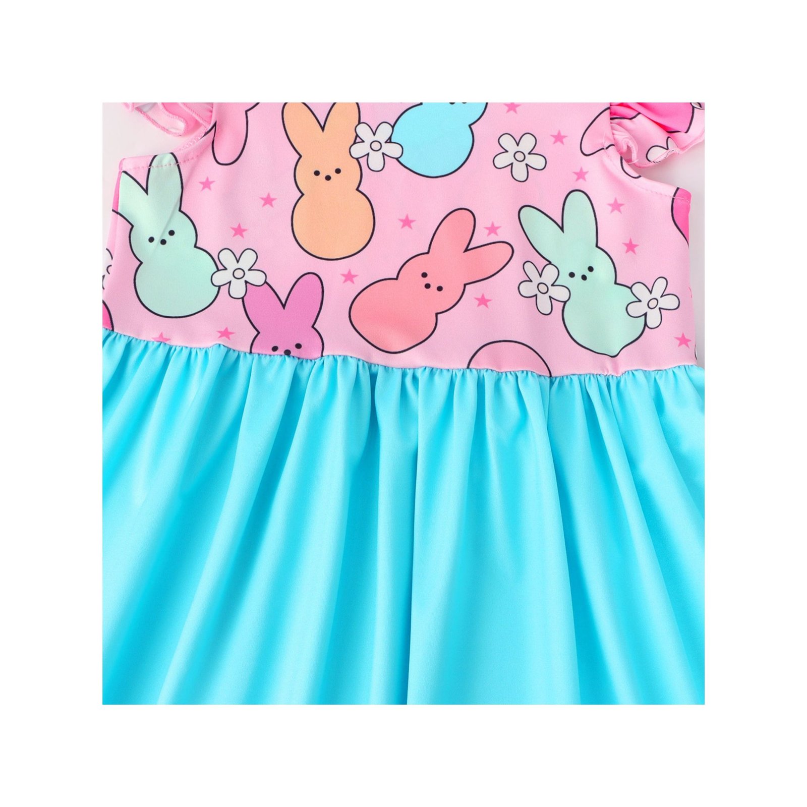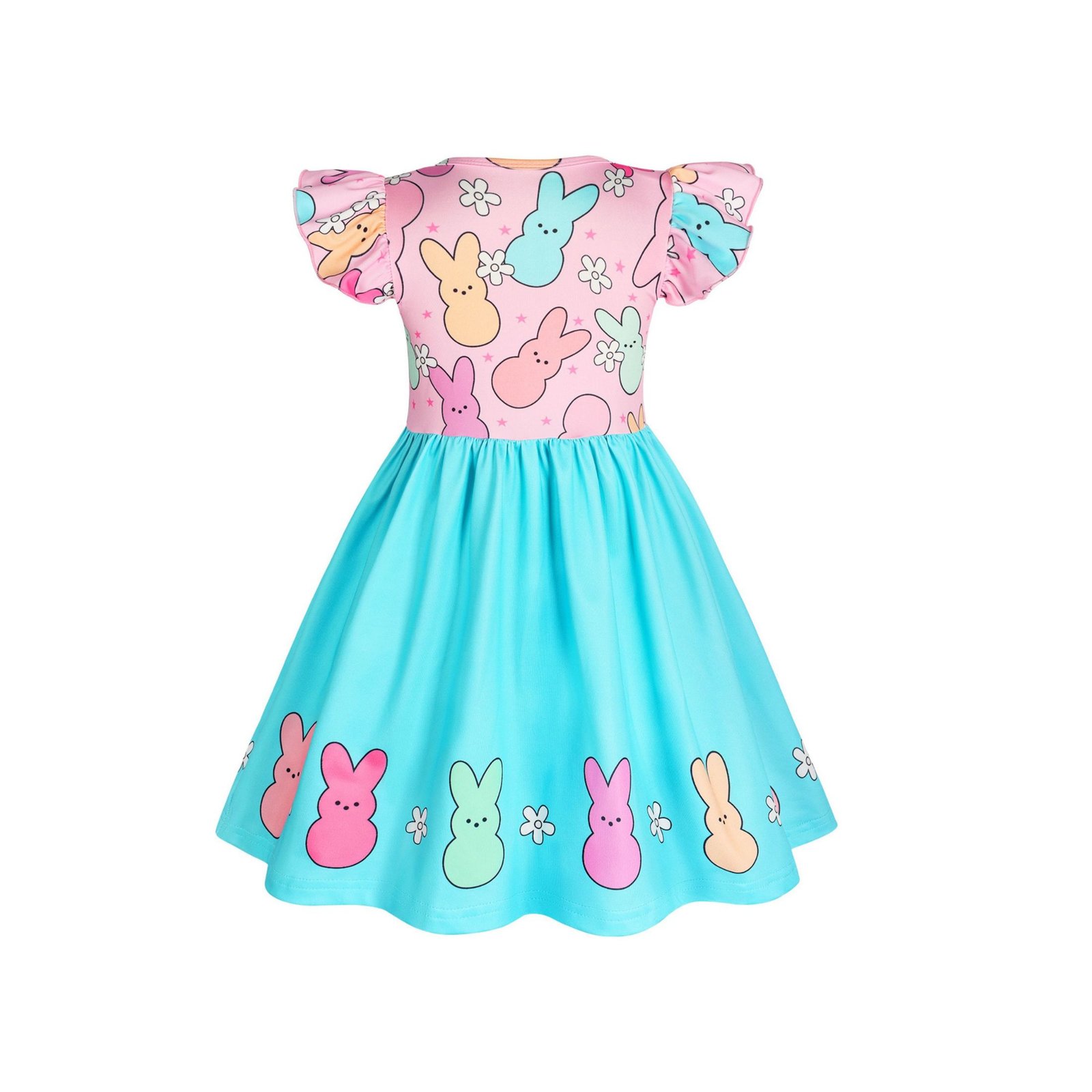 【Features of Bunny Nightgown】 Dress top: Crafted from a soft pink base fabric, printed with colorful marshmallow bunnies in pink, blue, yellow and green, paired with cute white daisy patterns and small star accents. The ruffled flutter sleeves add a sweet and playful touch, perfectly capturing the lively and festive charm of Easter. Bottom: A voluminous gathered sky-blue skirt, with a matching bunny and daisy print along the hem, creating a fresh and dreamy silhouette. The lightweight fabric allows little girls to twirl freely, embodying the joy and cuteness of the Easter holiday.