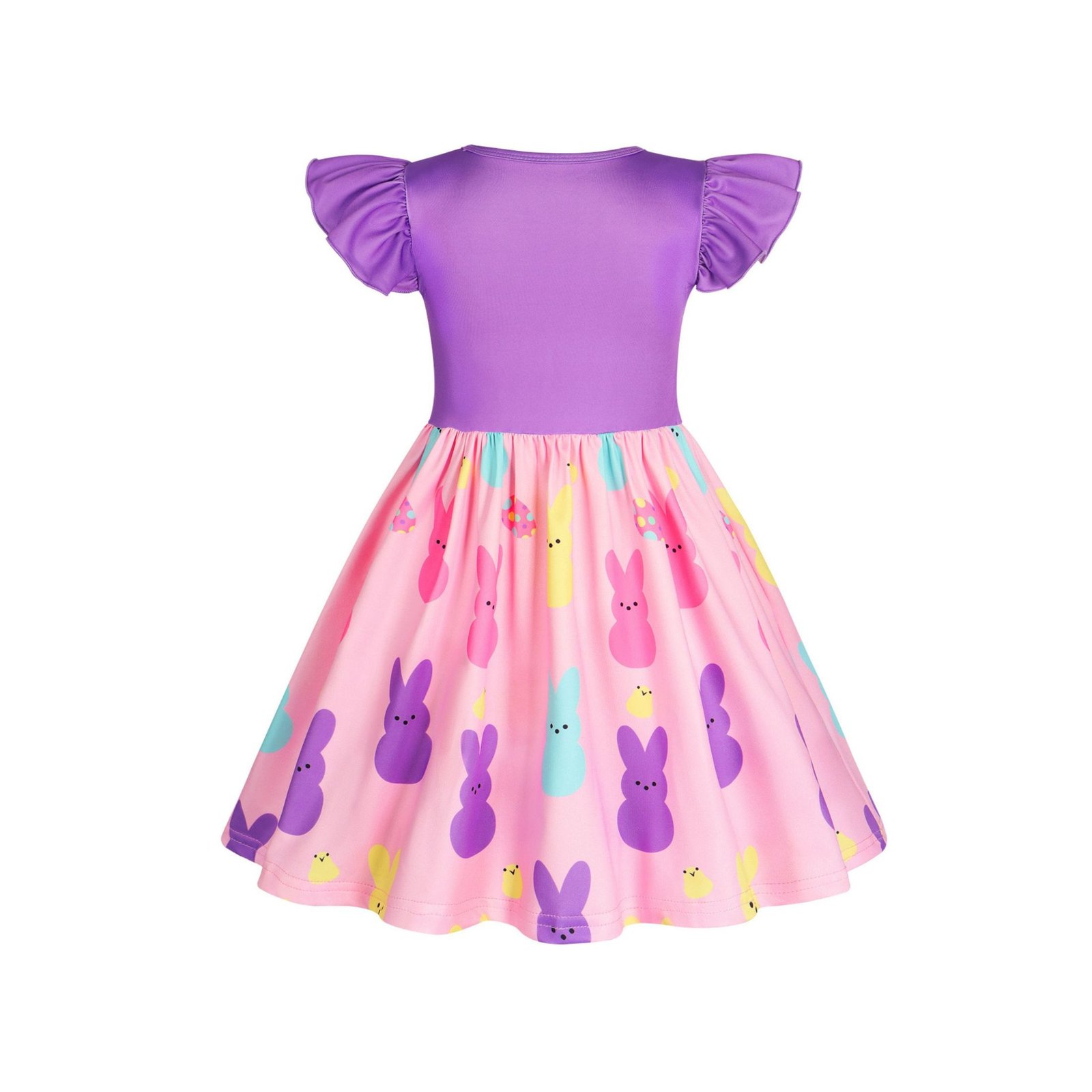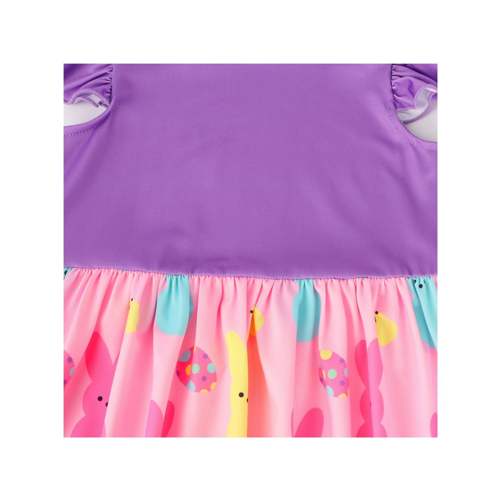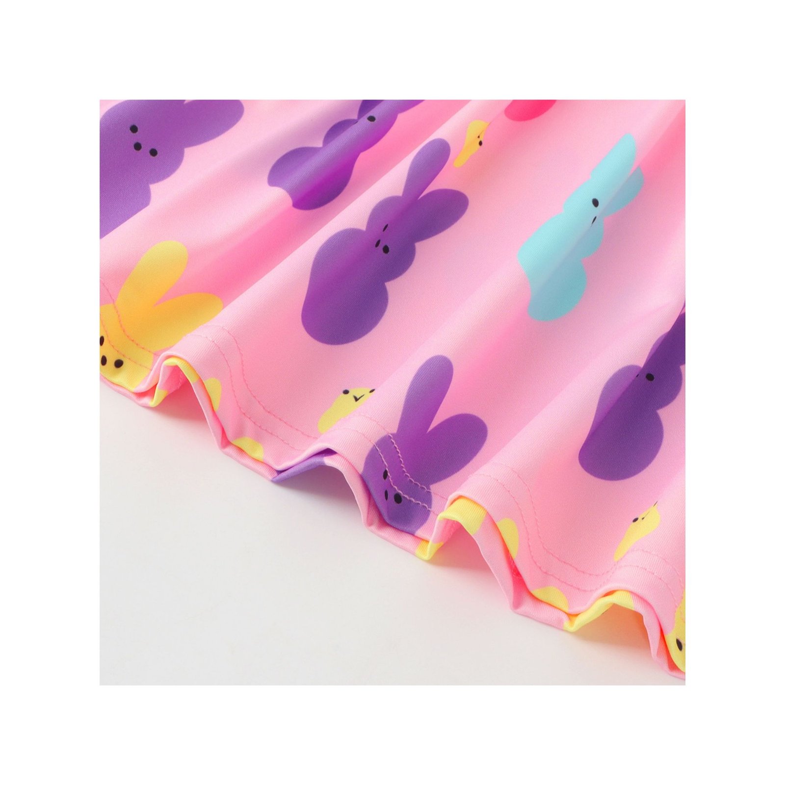 【Features of Bunny Dress】 Dress top: Crafted from a soft pink base fabric, printed with colorful marshmallow bunnies in pink, blue, yellow and green, paired with cute white daisy patterns and small star accents. The ruffled flutter sleeves add a sweet and playful touch, perfectly capturing the lively and festive charm of Easter. Bottom: A voluminous gathered sky-blue skirt, with a matching bunny and daisy print along the hem, creating a fresh and dreamy silhouette. The lightweight fabric allows little girls to twirl freely, embodying the joy and cuteness of the Easter holiday.
