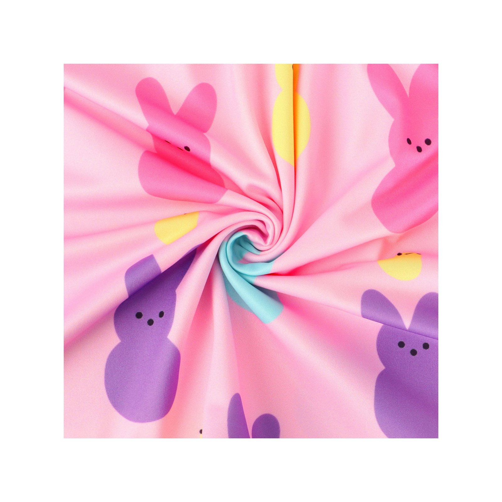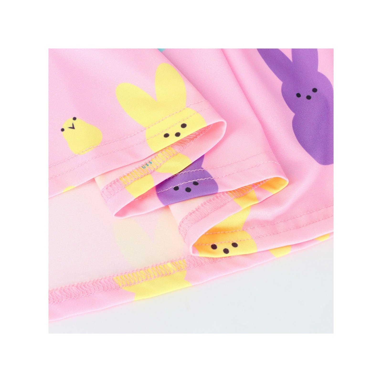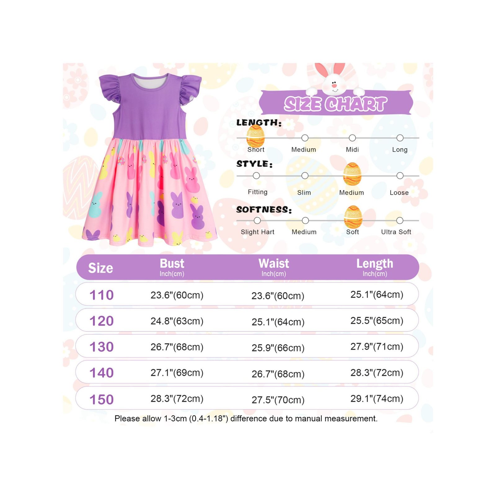 【Features of Bunny Dress】 Dress top: Crafted from a soft pink base fabric, printed with colorful marshmallow bunnies in pink, blue, yellow and green, paired with cute white daisy patterns and small star accents. The ruffled flutter sleeves add a sweet and playful touch, perfectly capturing the lively and festive charm of Easter. Bottom: A voluminous gathered sky-blue skirt, with a matching bunny and daisy print along the hem, creating a fresh and dreamy silhouette. The lightweight fabric allows little girls to twirl freely, embodying the joy and cuteness of the Easter holiday.
