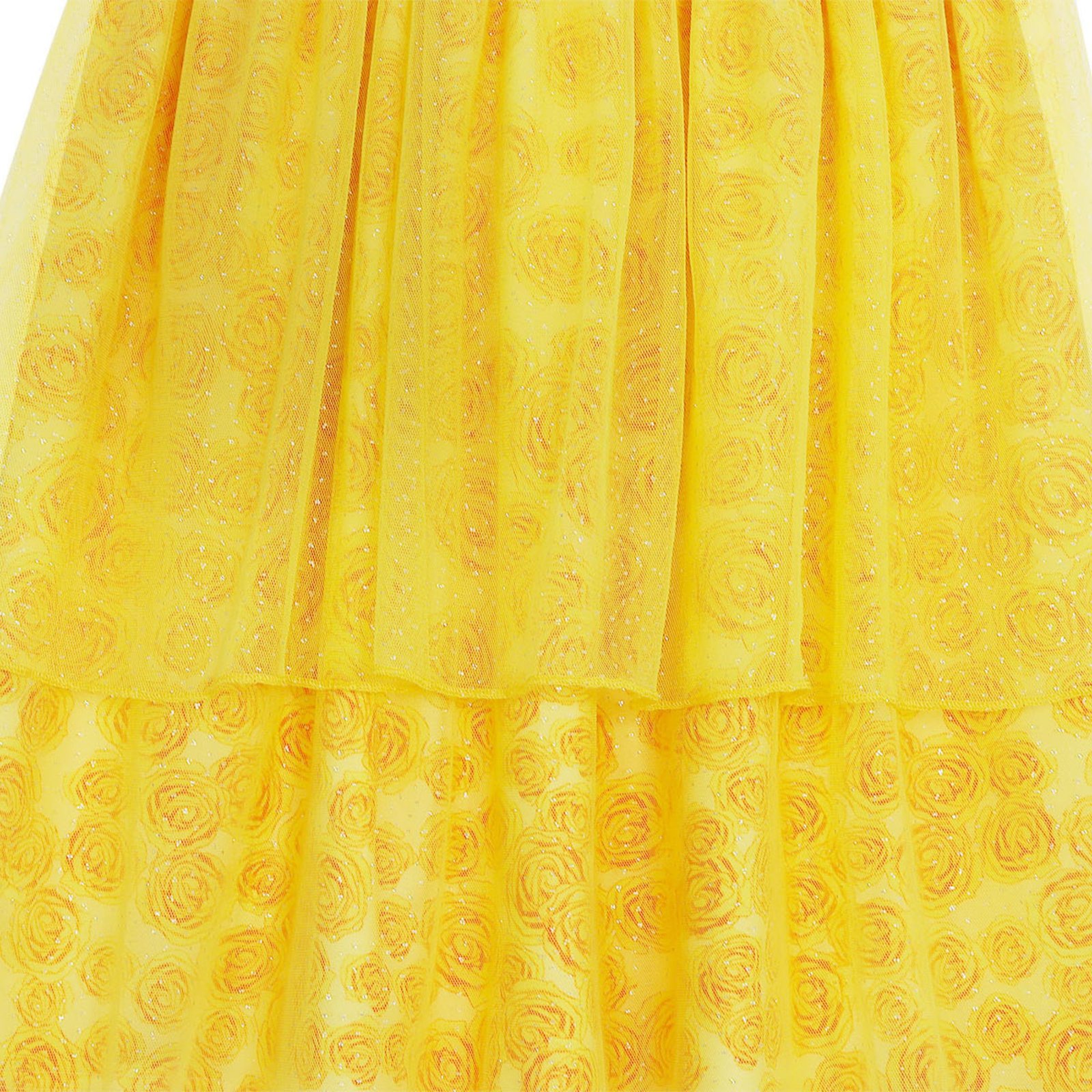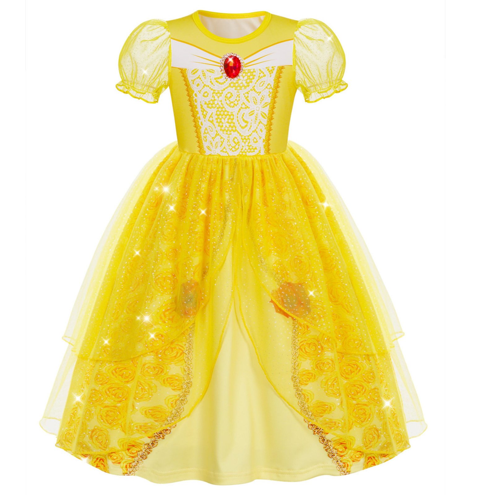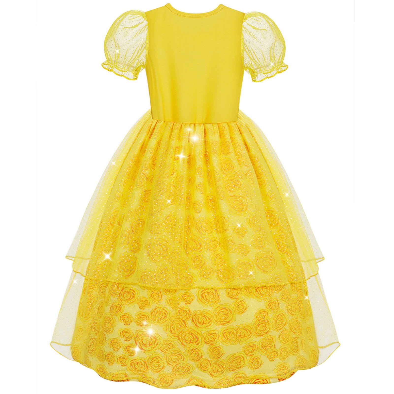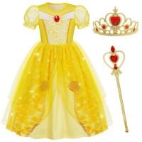 Adorable Princess Dress Design– Features iconic yellow and gold color scheme, rosette embellishments, and sparkling details inspired by Belle’s ball gown.