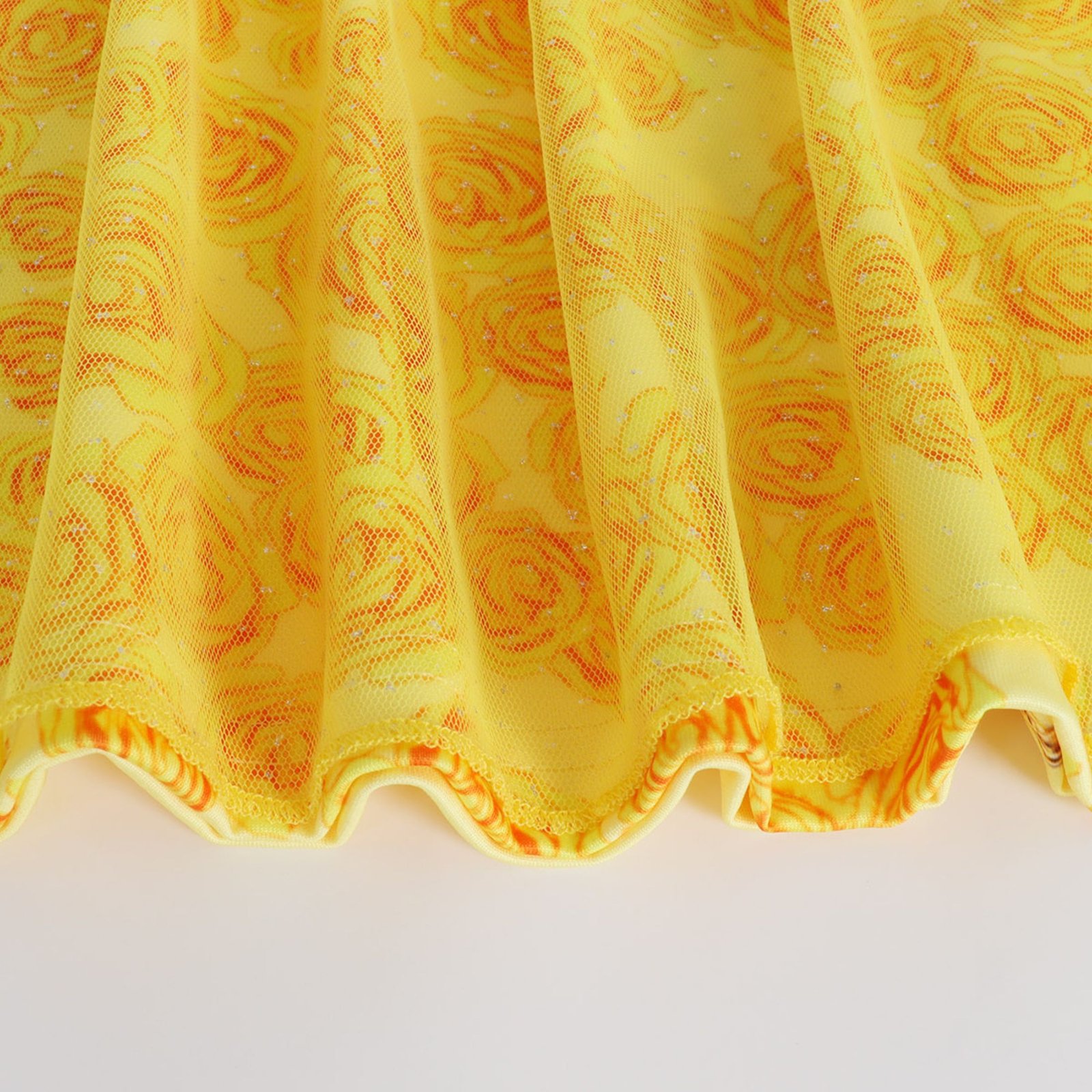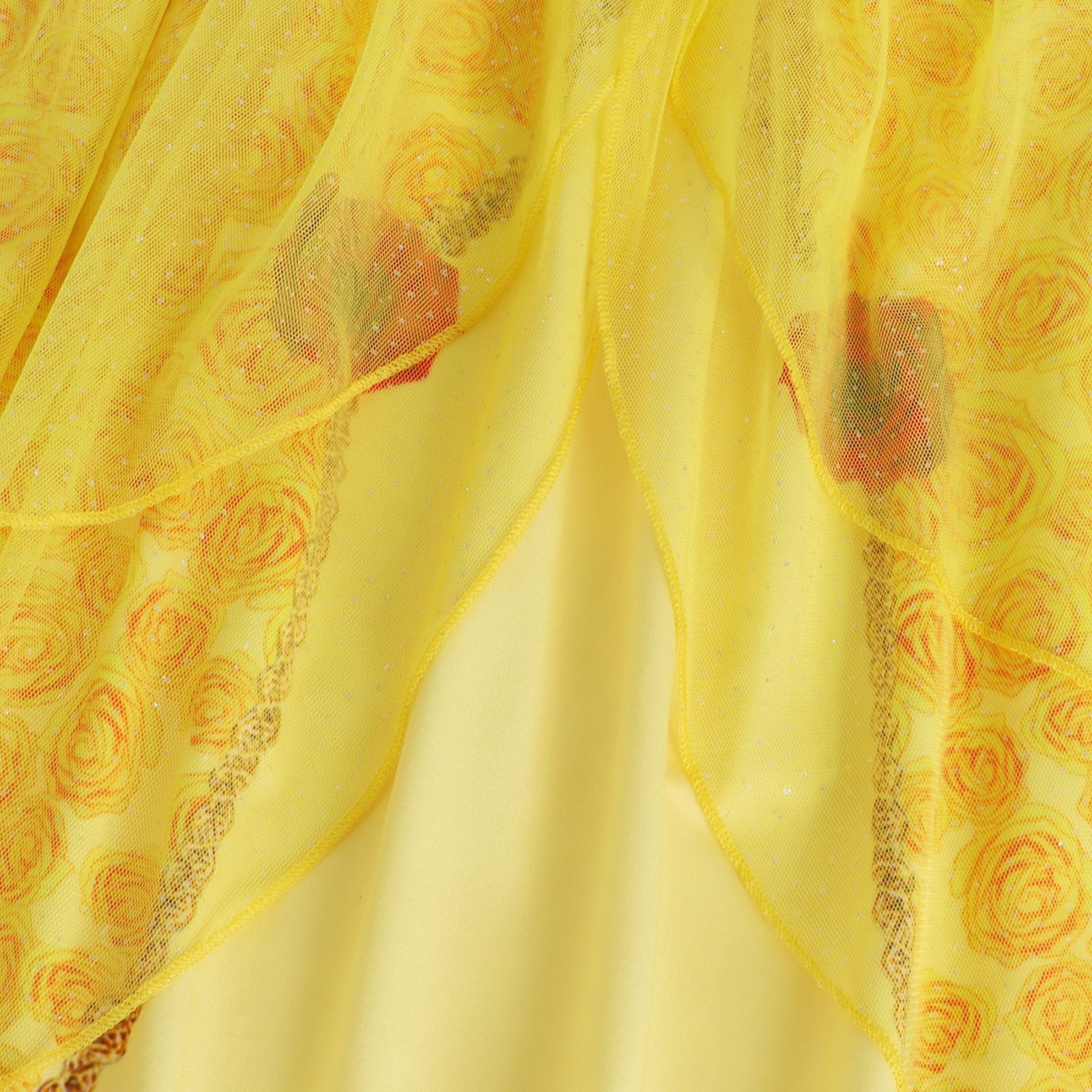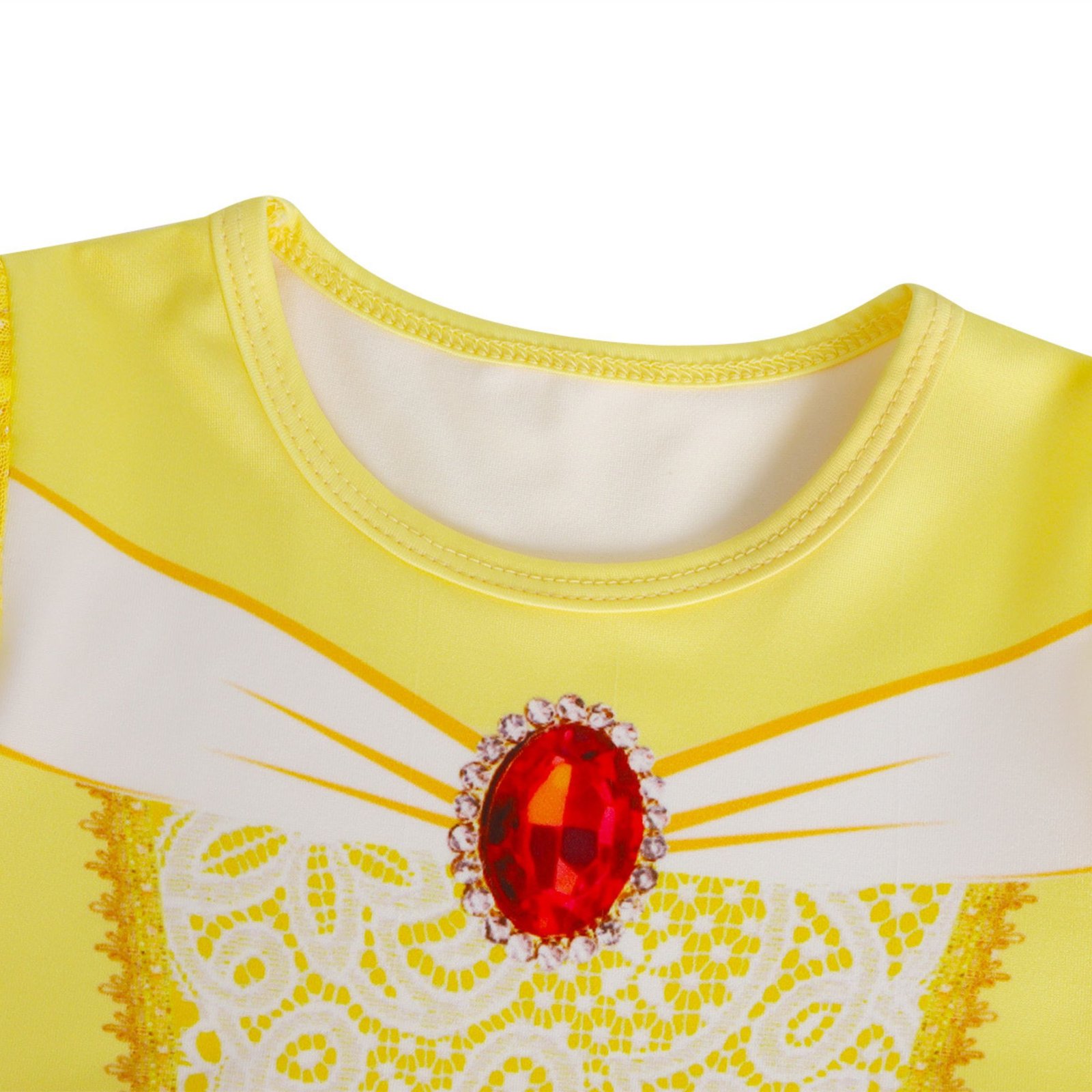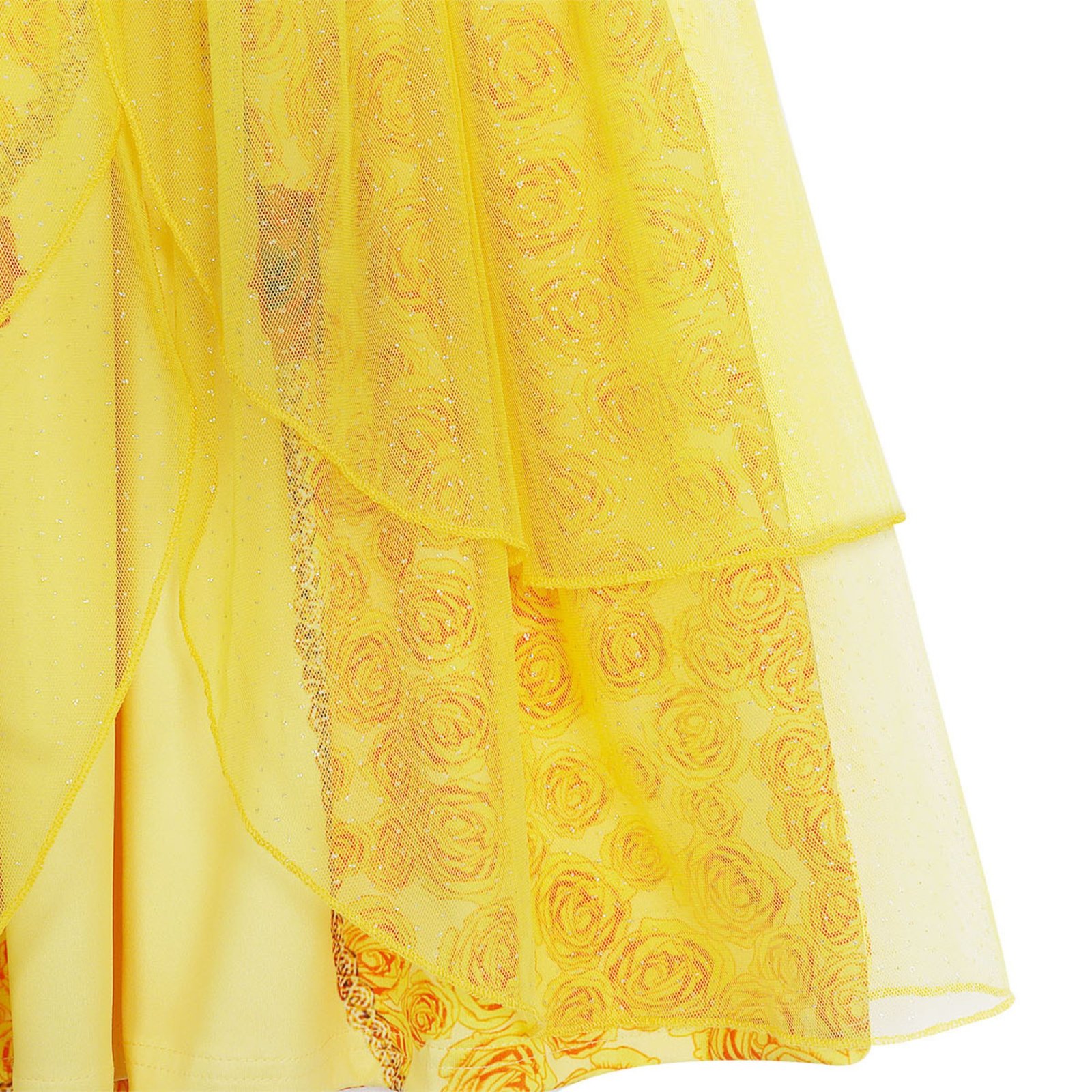 Adorable Princess Dress Design– Features iconic yellow and gold color scheme, rosette embellishments, and sparkling details inspired by Belle’s ball gown.