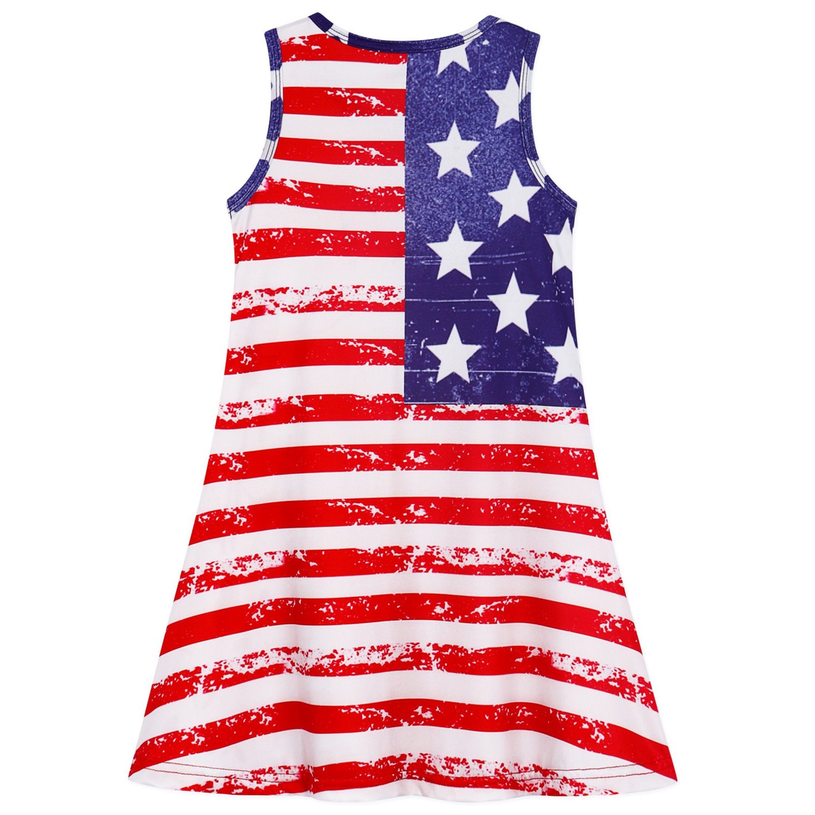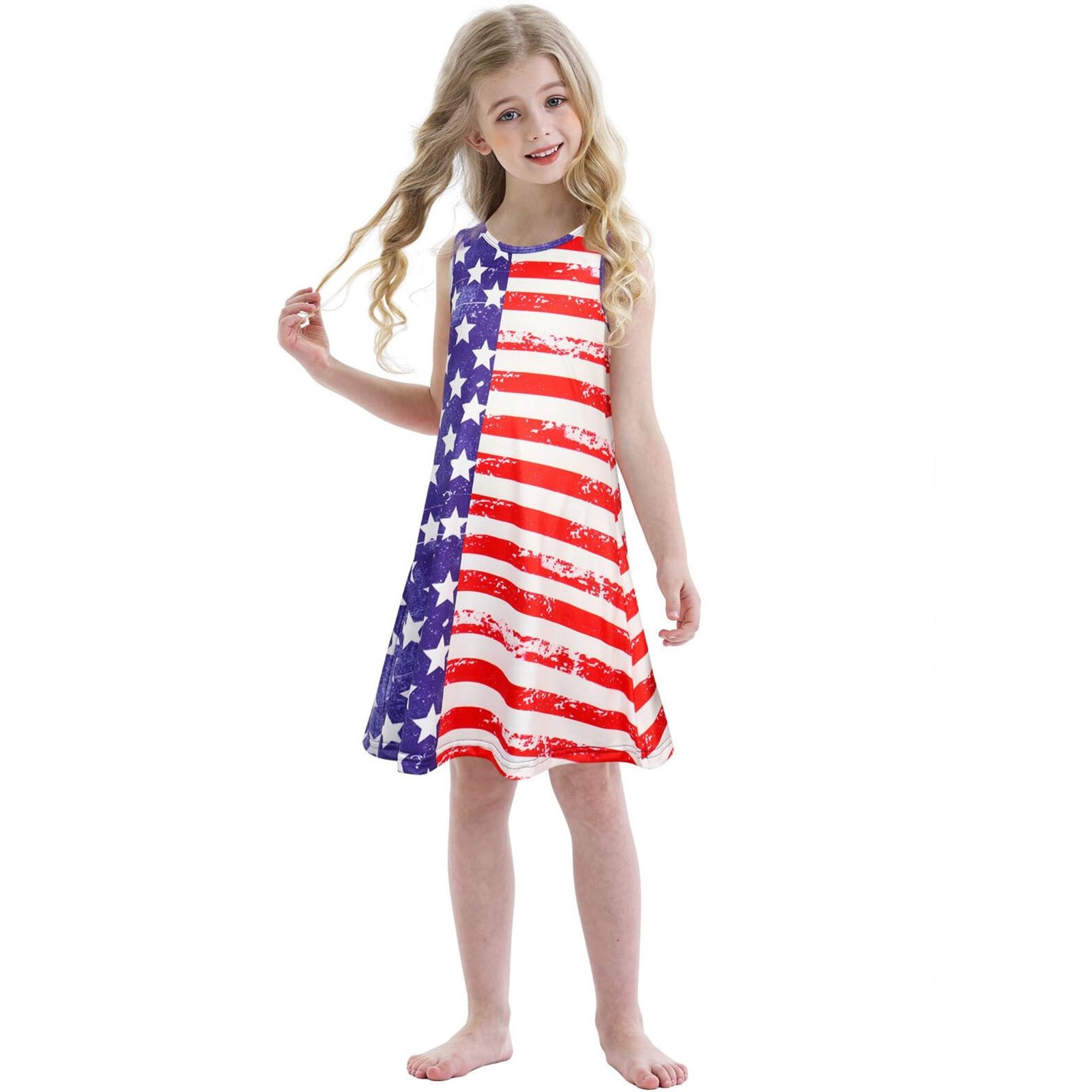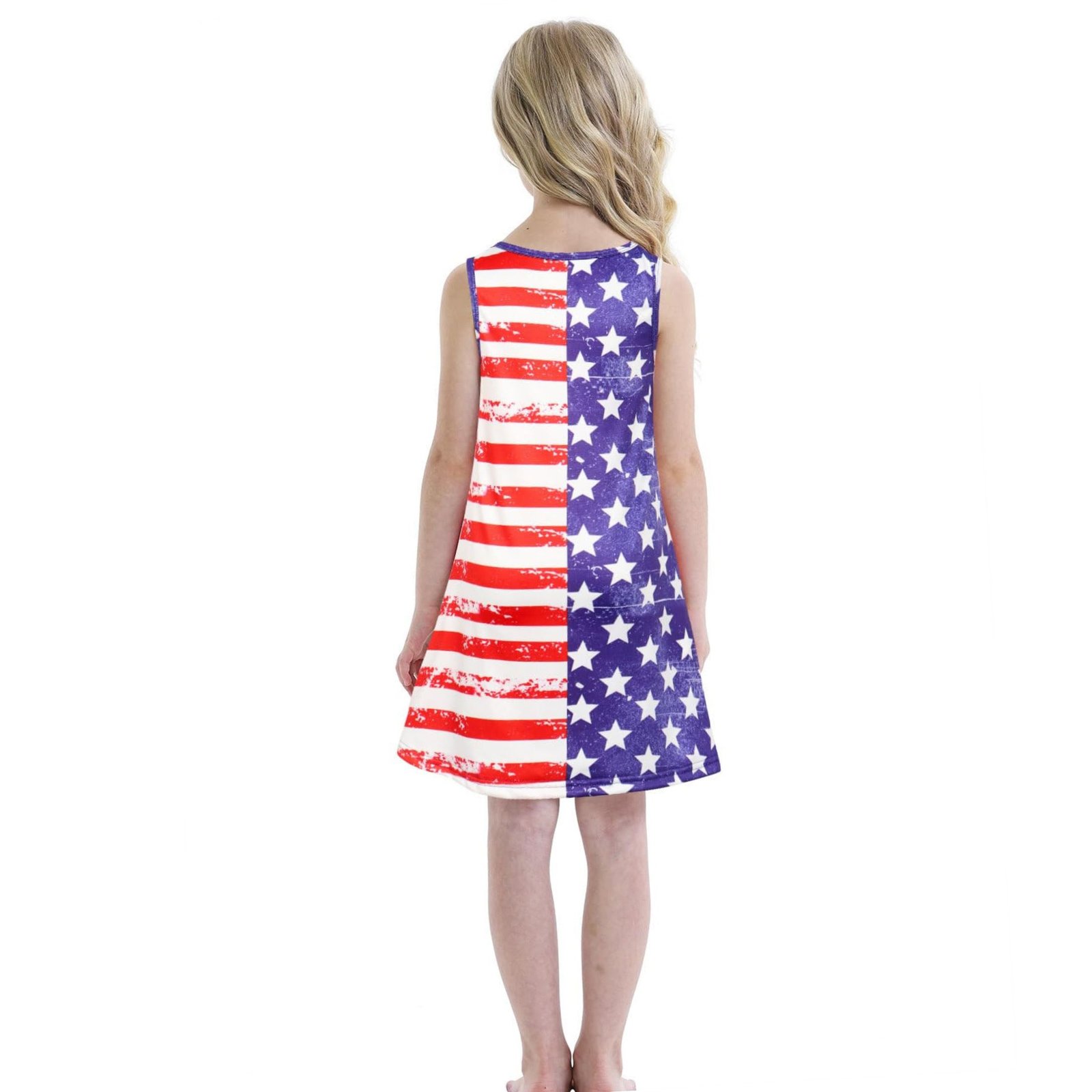 Independence Day summer dress for girls is designed to knees length, round collar, sleeveless, simple pullover style, american flag stars stripes prints are fun to wear, every girl will enjoy this sleeveless tank swing dresses and receive many compliments.