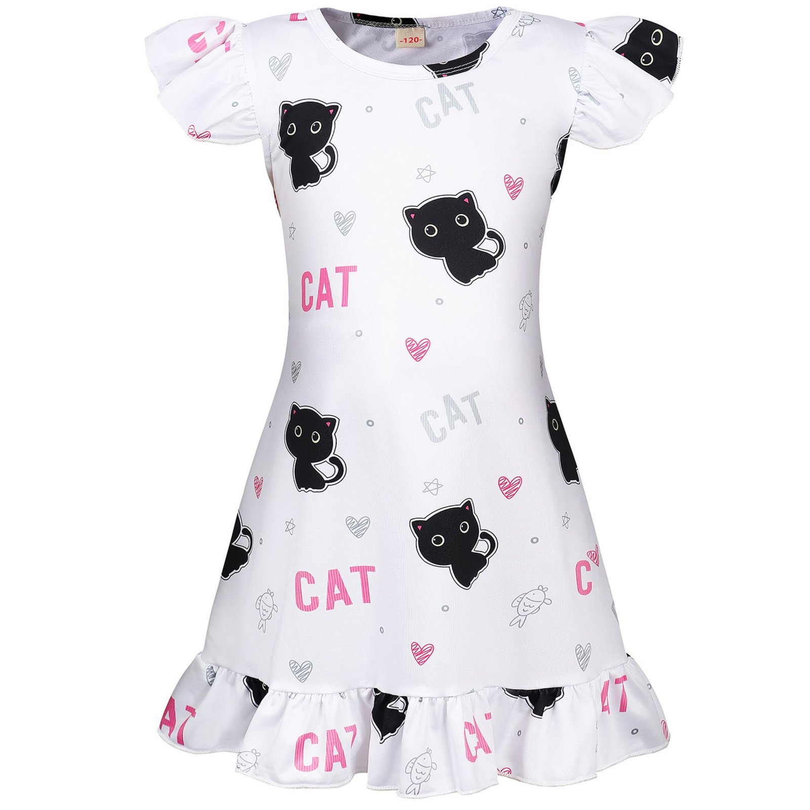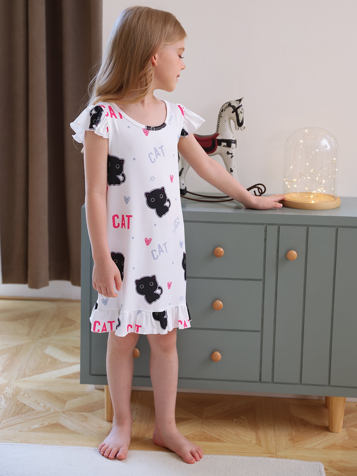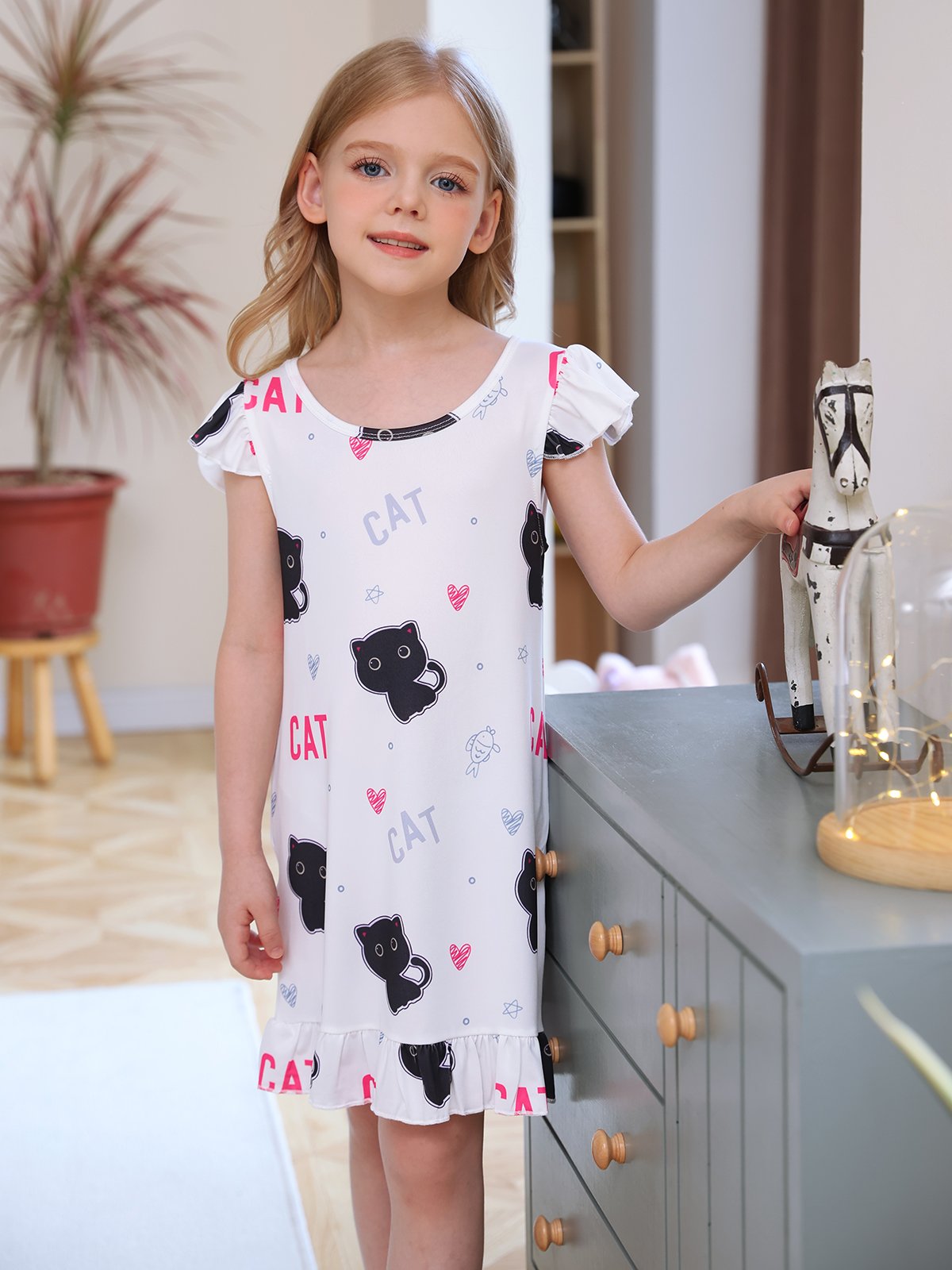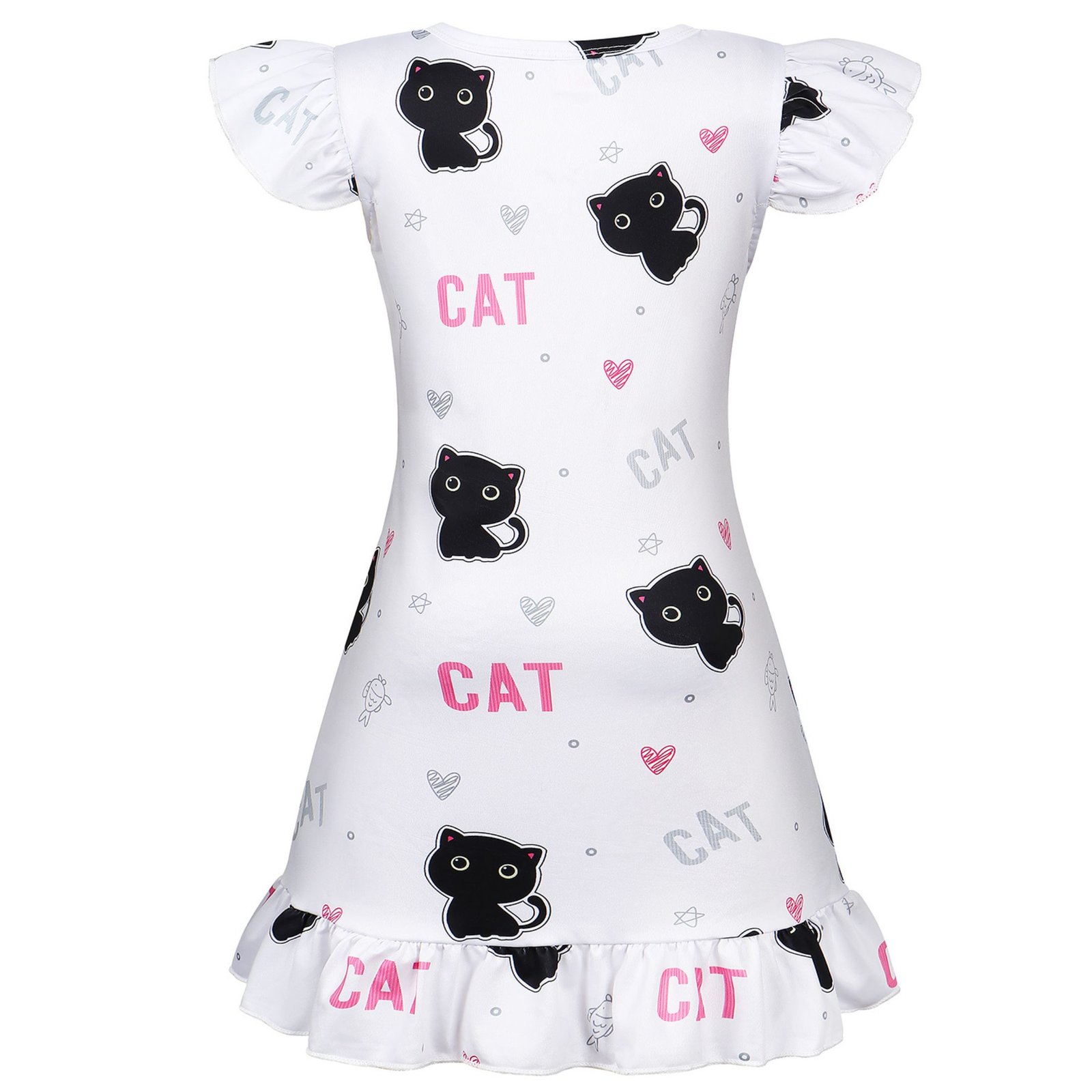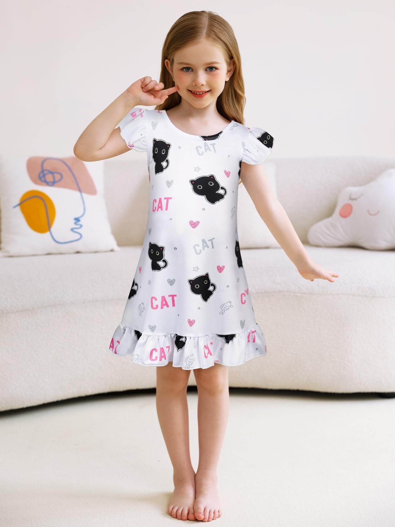❤Cute Cat Nightdress-Crew Neck, Short Flutter Sleeves, Cute Cat Patterns, Cat pajamas more vibrant and bright, kids princess pajamas easy to put on and take off.