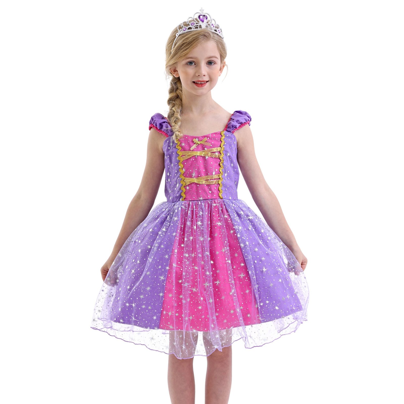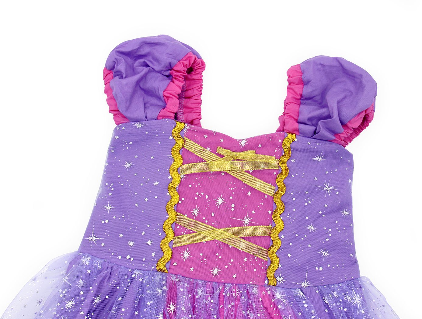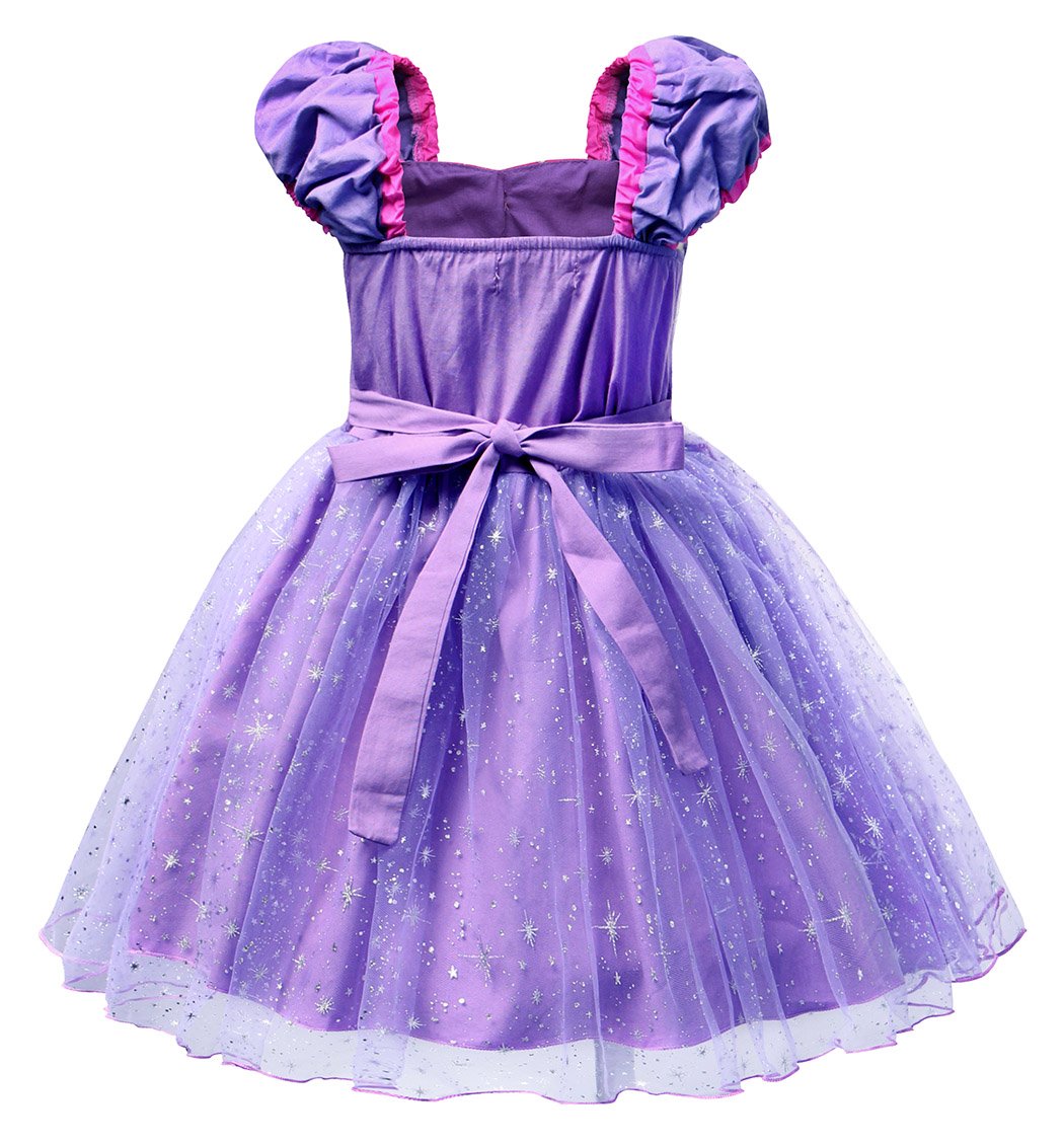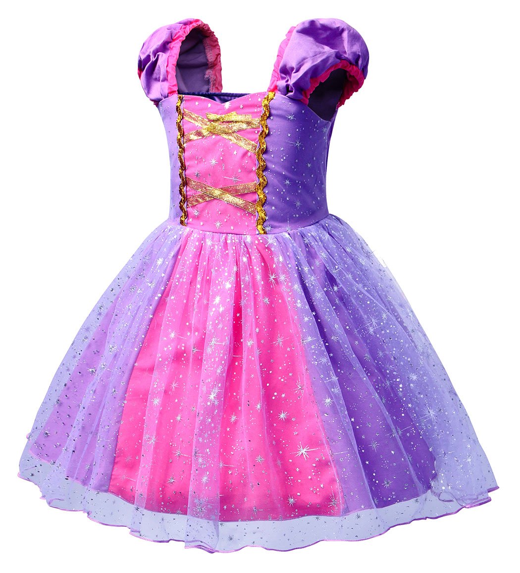 - EXQUISITE DETAILS: Rapunzel dress for Girls① Elastic waistband,freely adjust the waist.② short-sleeved shoulder design,will not slip off.③ multi-layer design,bringing three-dimensional and comfortable feeling.④ shining stars,perfect embellishment.