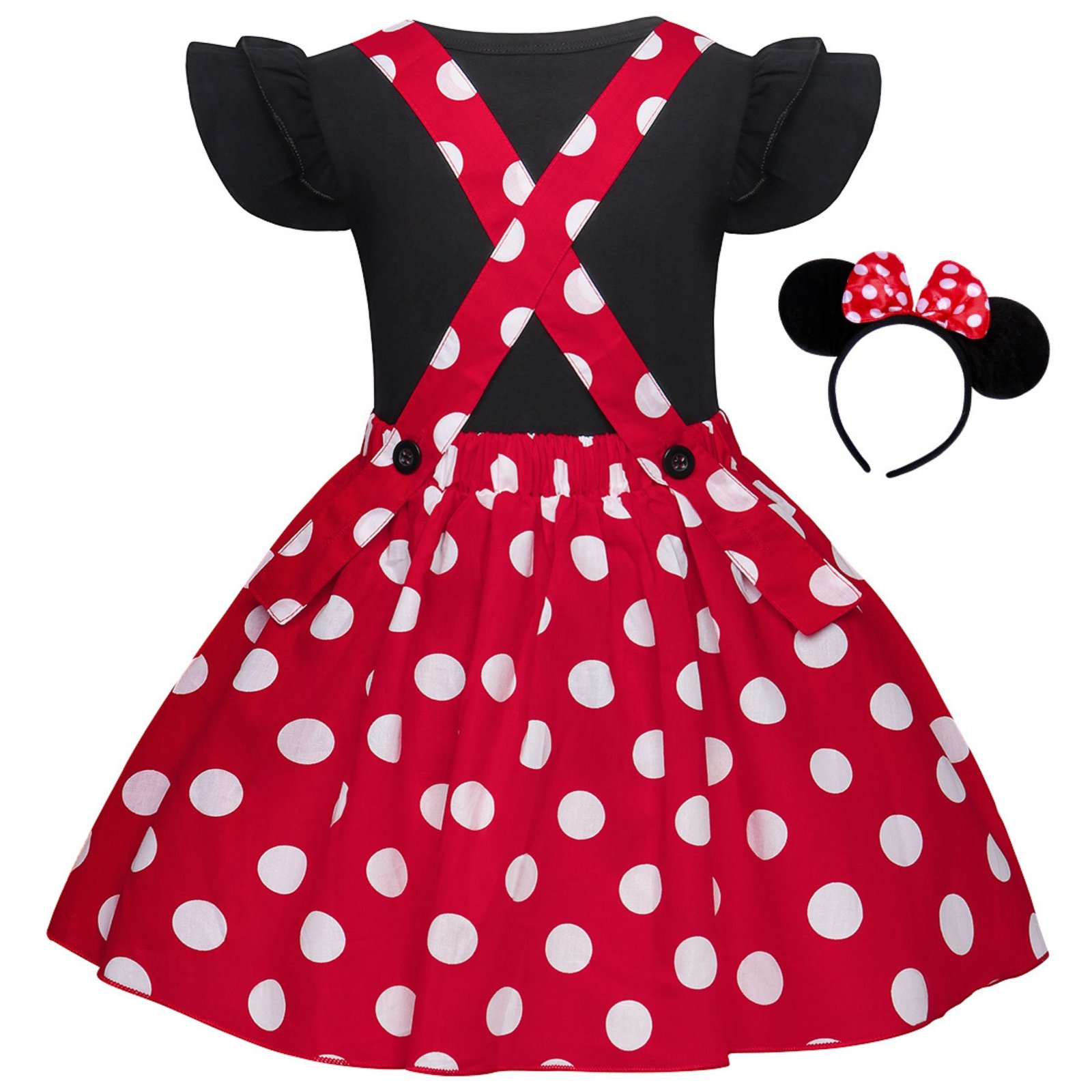Cute newborn infant baby kids girls black romper, Stunning red and white polka dots fancy minnie dress up costume inspired by the iconic minnie mouse character! 3 Pieces clothing sets with minnie mouse T-shirt, suspender skirt and mouse ear headband!