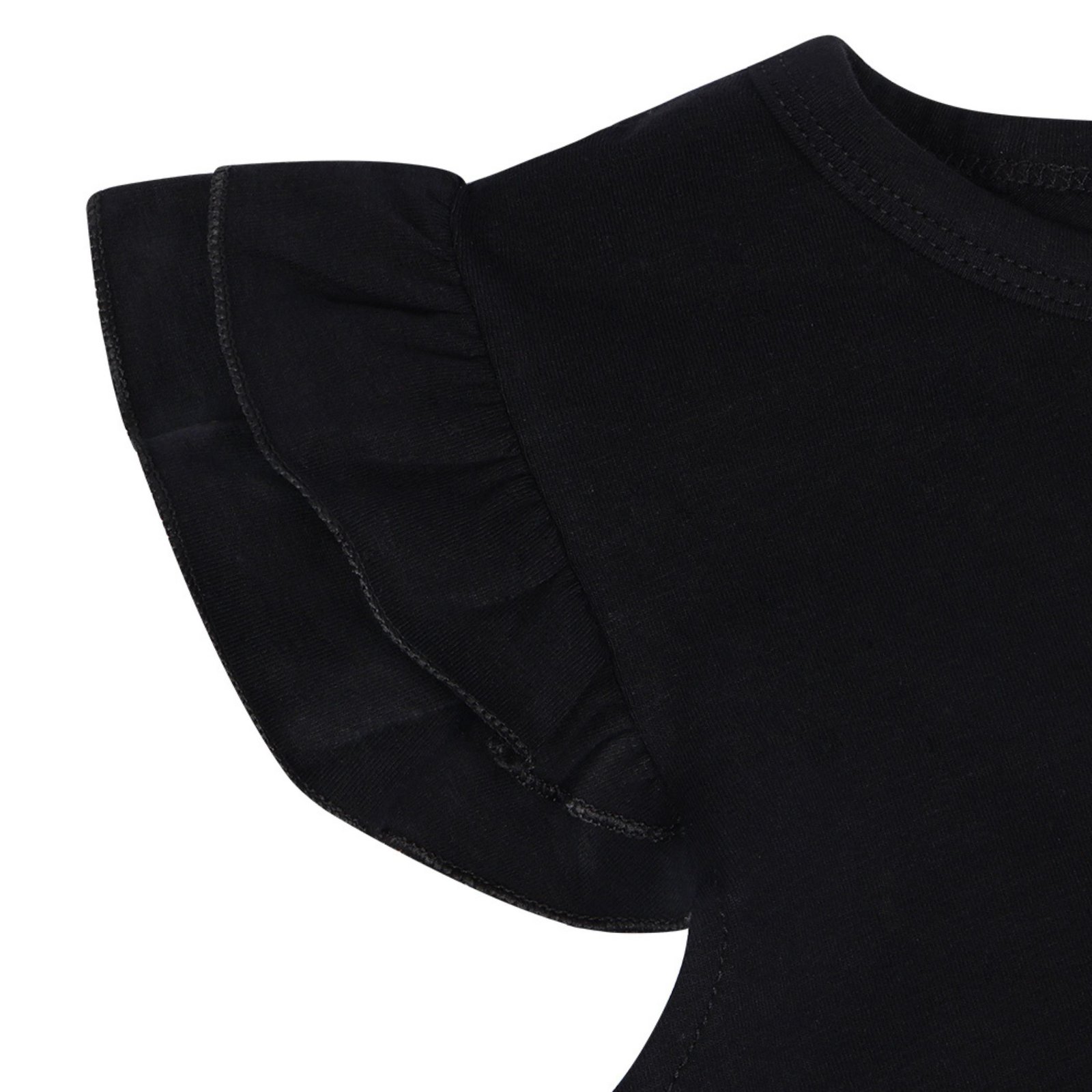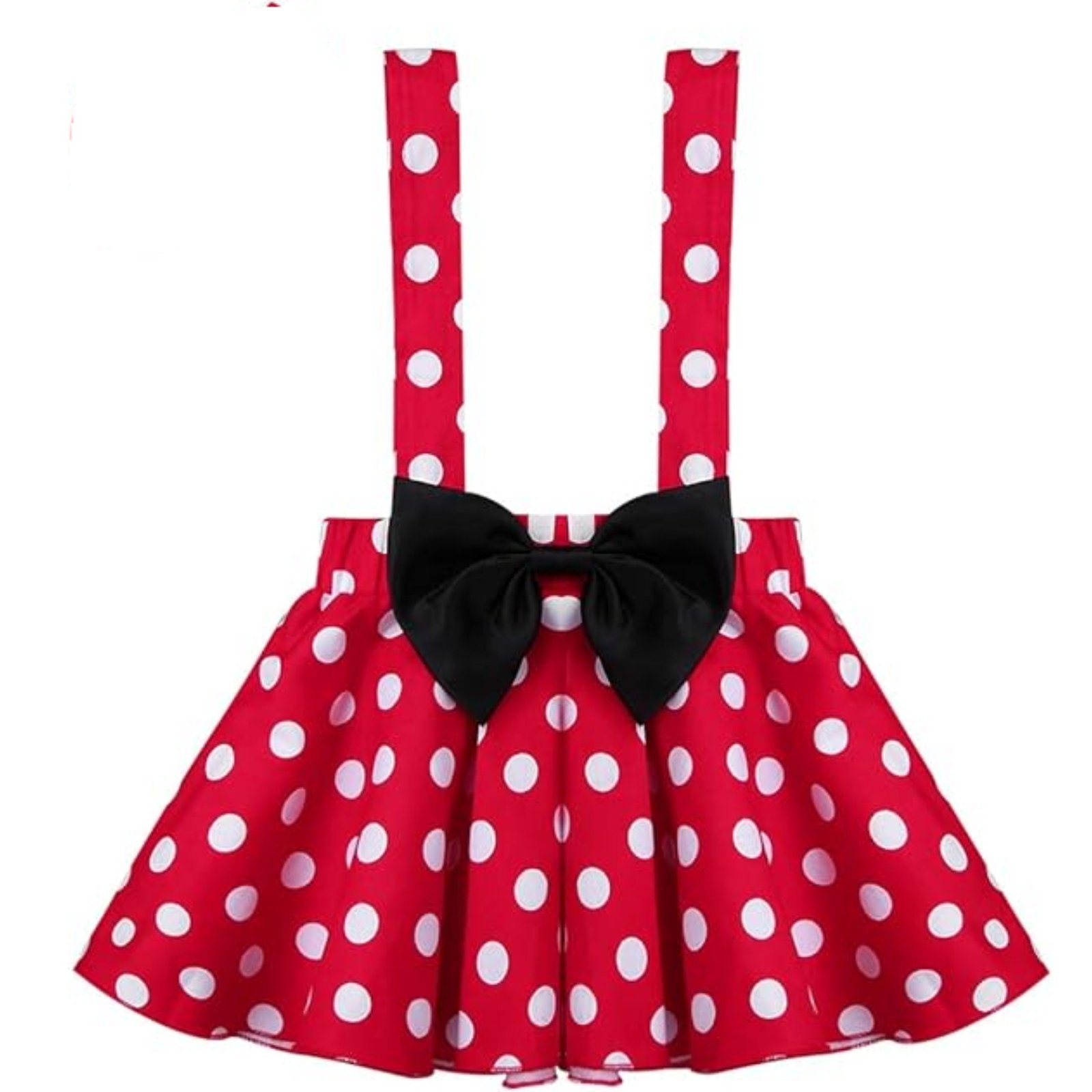 Stunning inspired mouse costume tutu dress with a mouse ear hair hoop headband.Short sleeves black t shirt with crewneck and sweet ruffles on shoulders. Polka dots suspender skirt with elastic waistband and adjustable straps by buttons. Complete the look with a cute bowknot hairband!