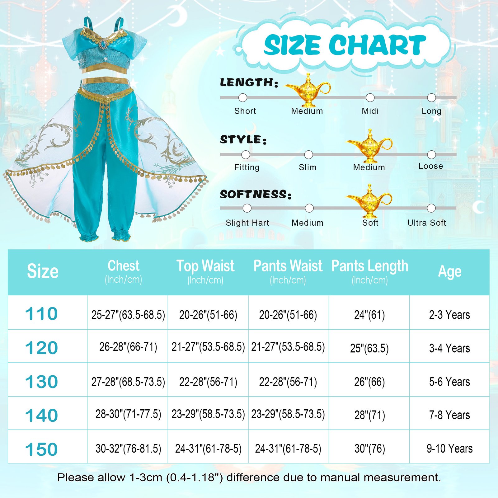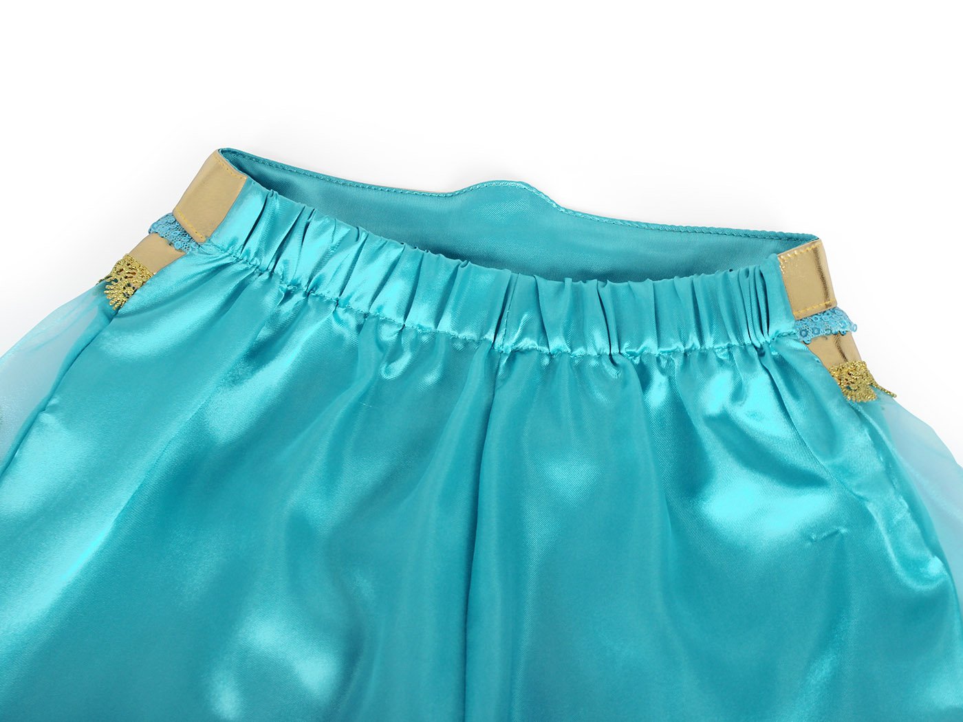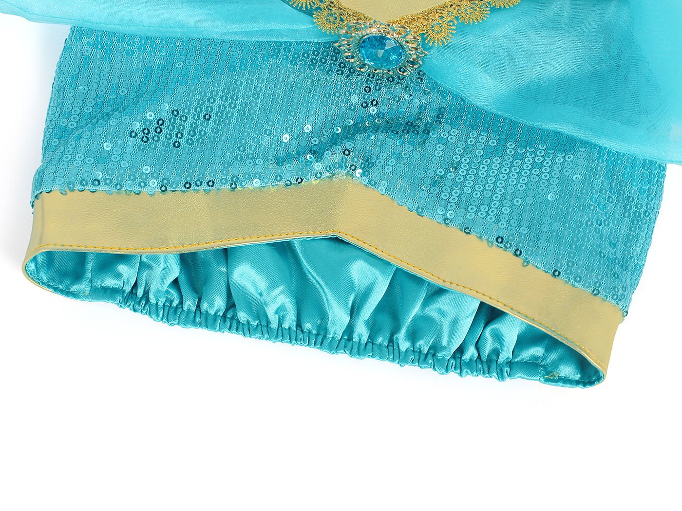 ❤ Jasmine costume Chic design:A-line,V-neck,glittering sequins or shiny faux diamonds on the chest and the trousers The skirt is provided with a shimmering overlay Realization of your little girl’s princess dream.