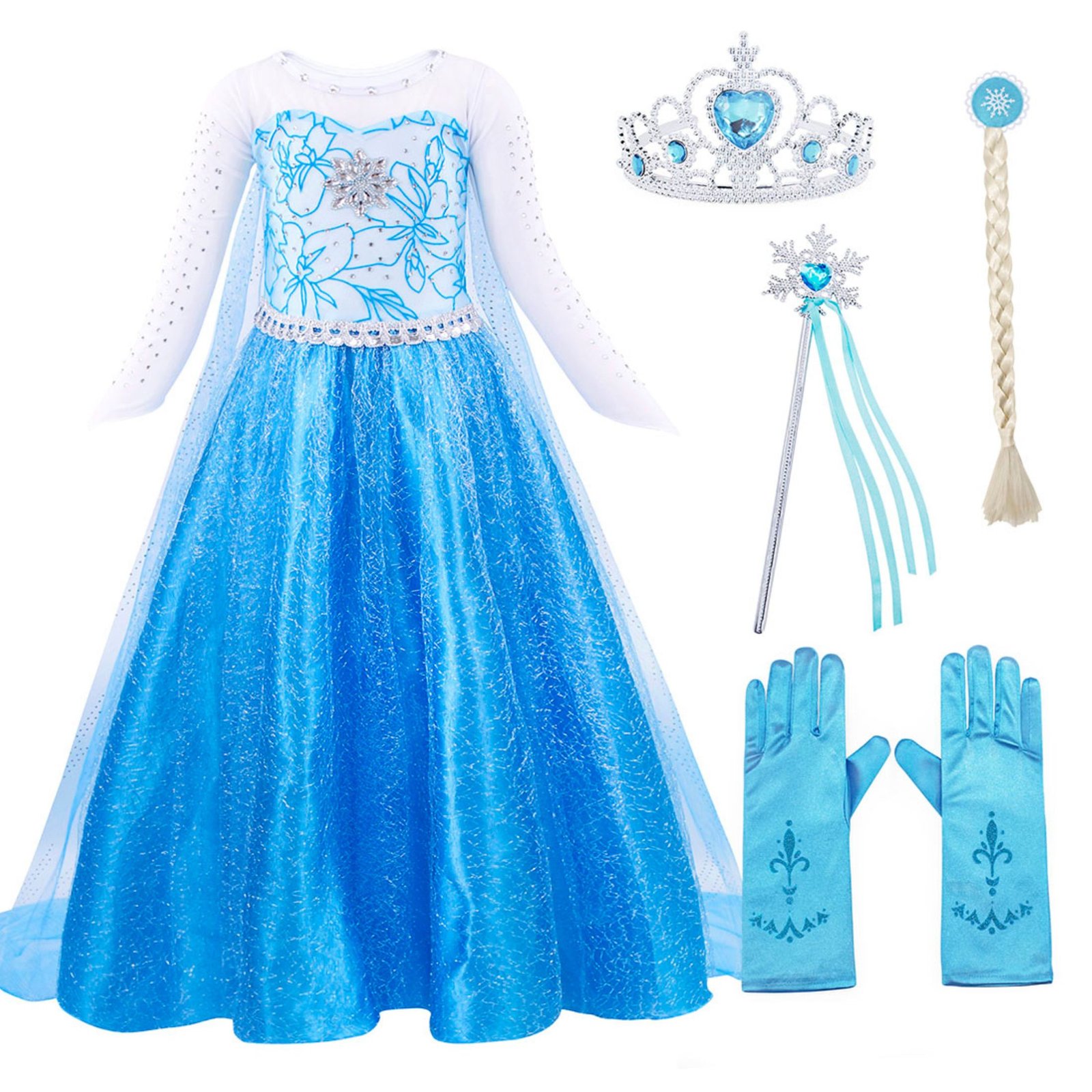 【EXQUISITE SET】the set contains elsa princess dress,elsa gloves,magic wand,braids and princess crown.all girls love to wear princess dresses and feel like a real princess wearing it.