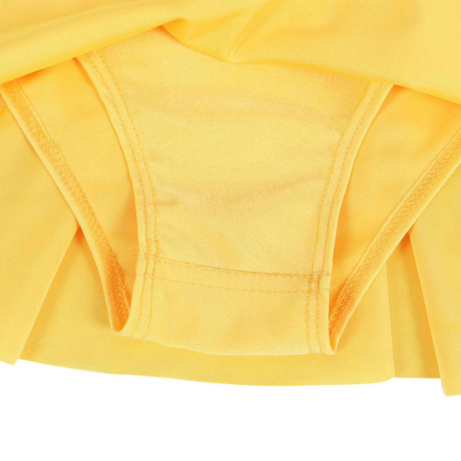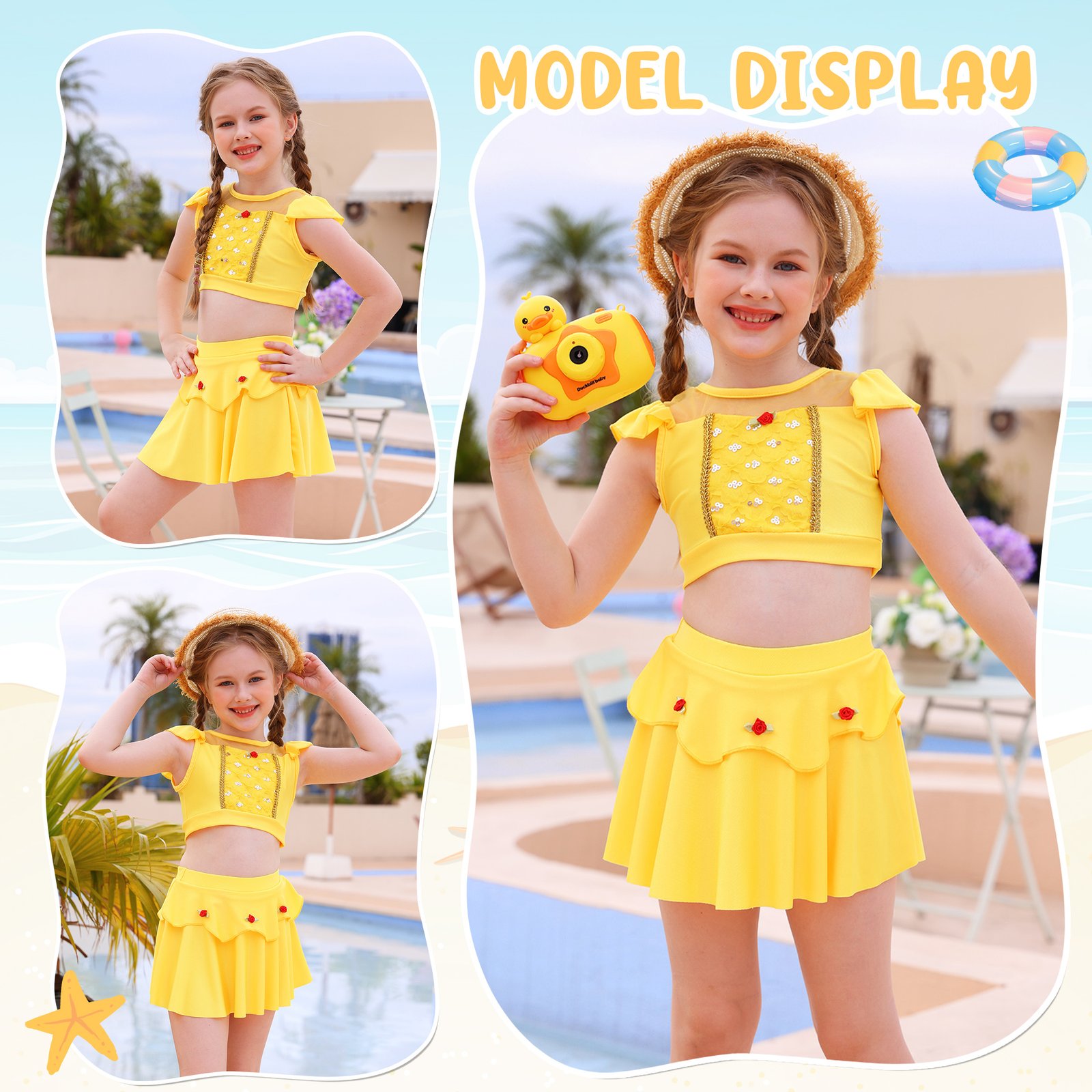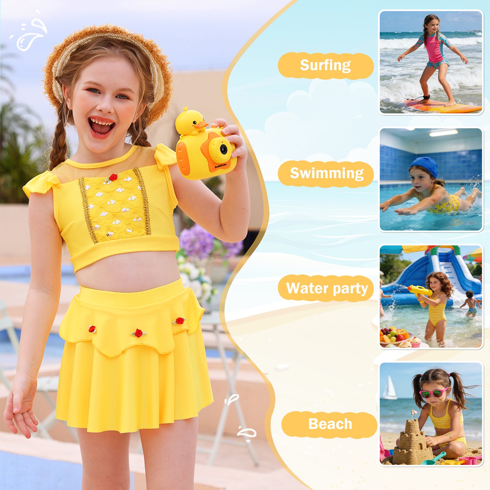 Lovely ruffles off shoulder tankinis with shoulder straps allows your little girl to move freely. Shoulder straps can adjusted in length. And there is a adorable bow on the swimming skirt.