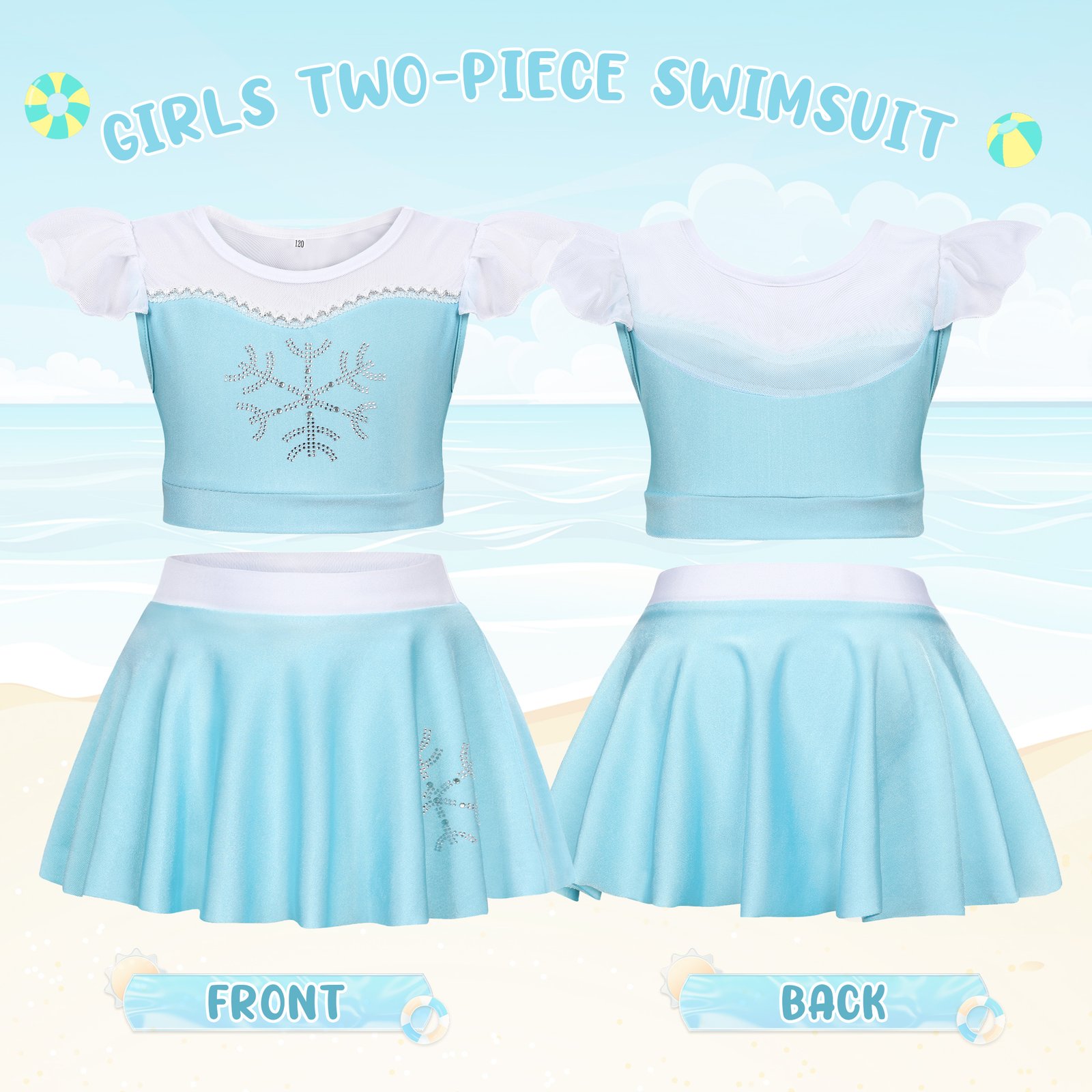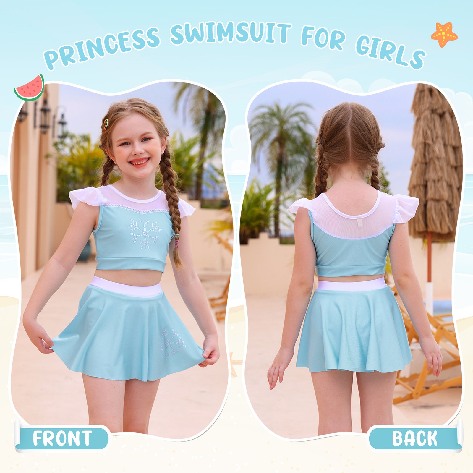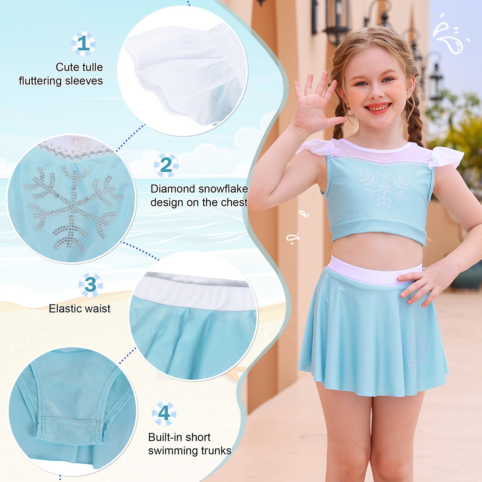 Girls Elsa Bikinis Lovely ruffles off shoulder tankinis with shoulder straps allows your little girl to move freely. Shoulder straps can adjusted in length. And there is a adorable bow on the swimming skirt.