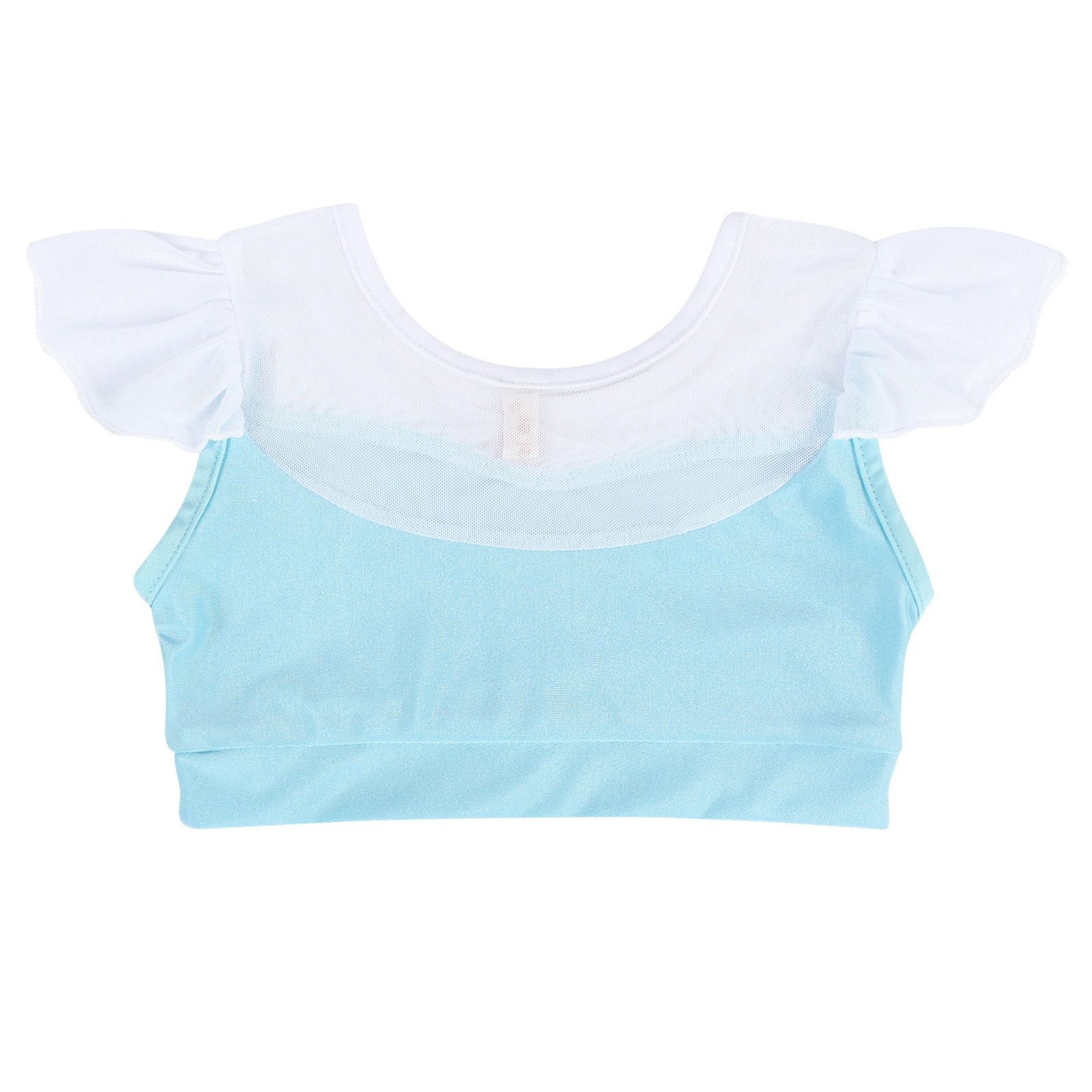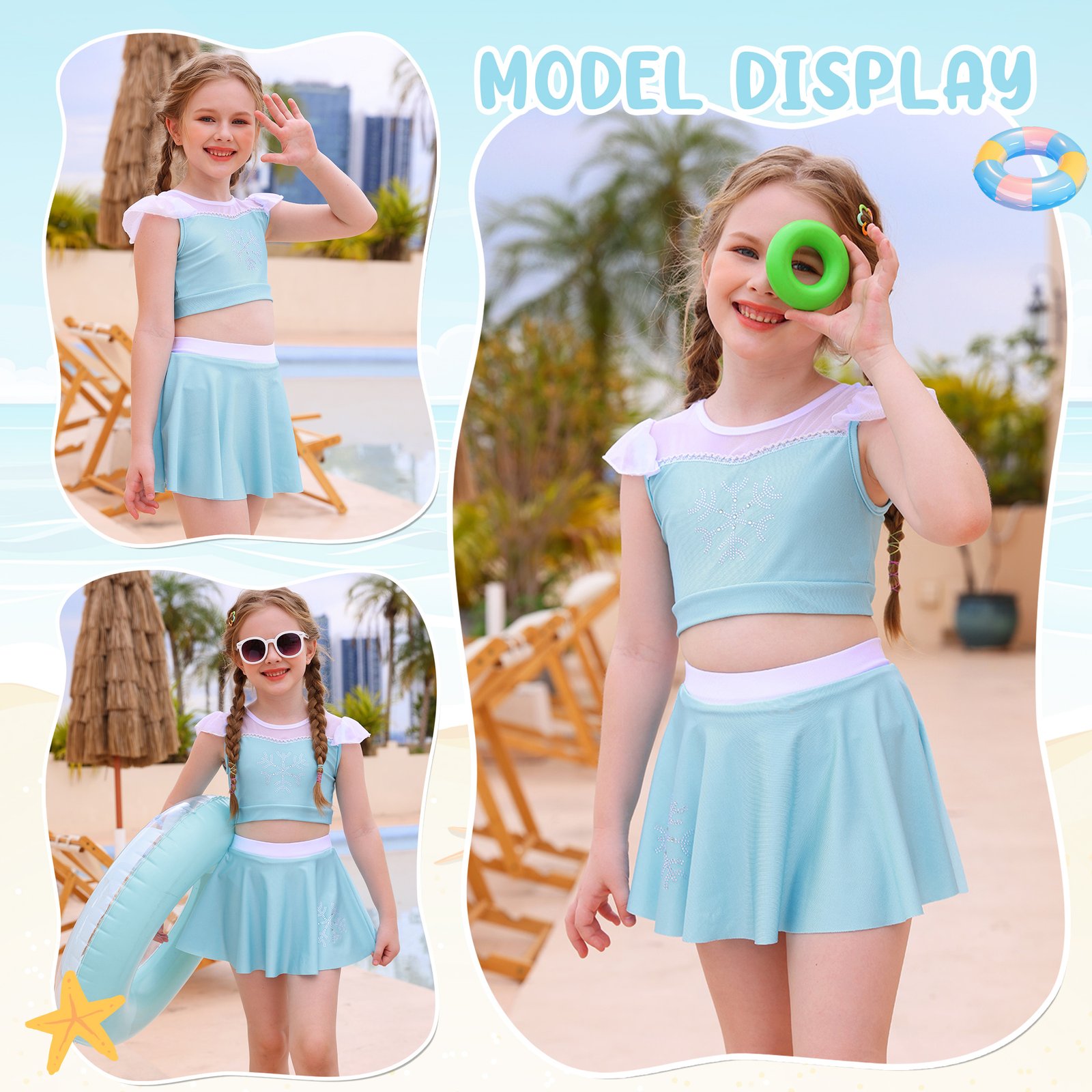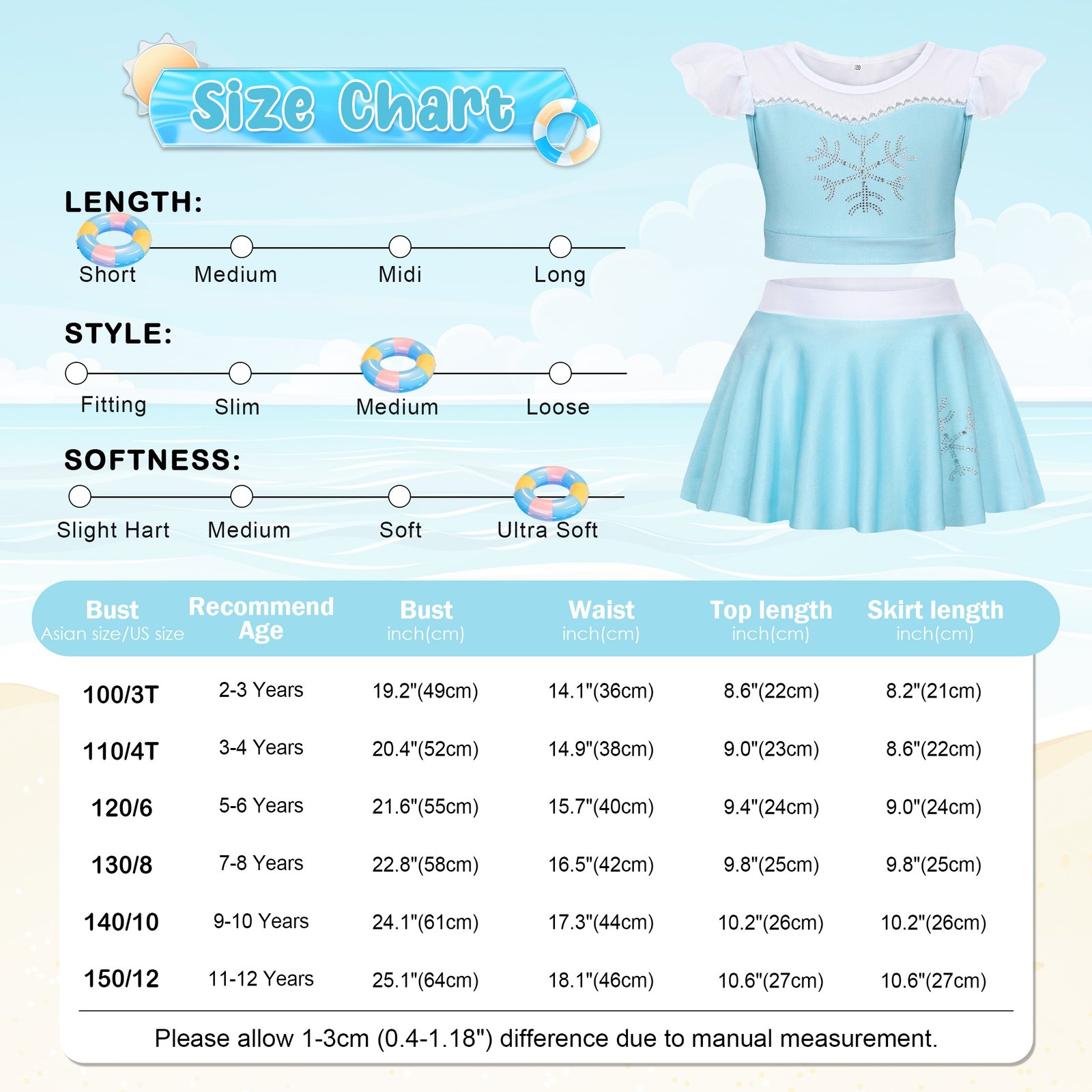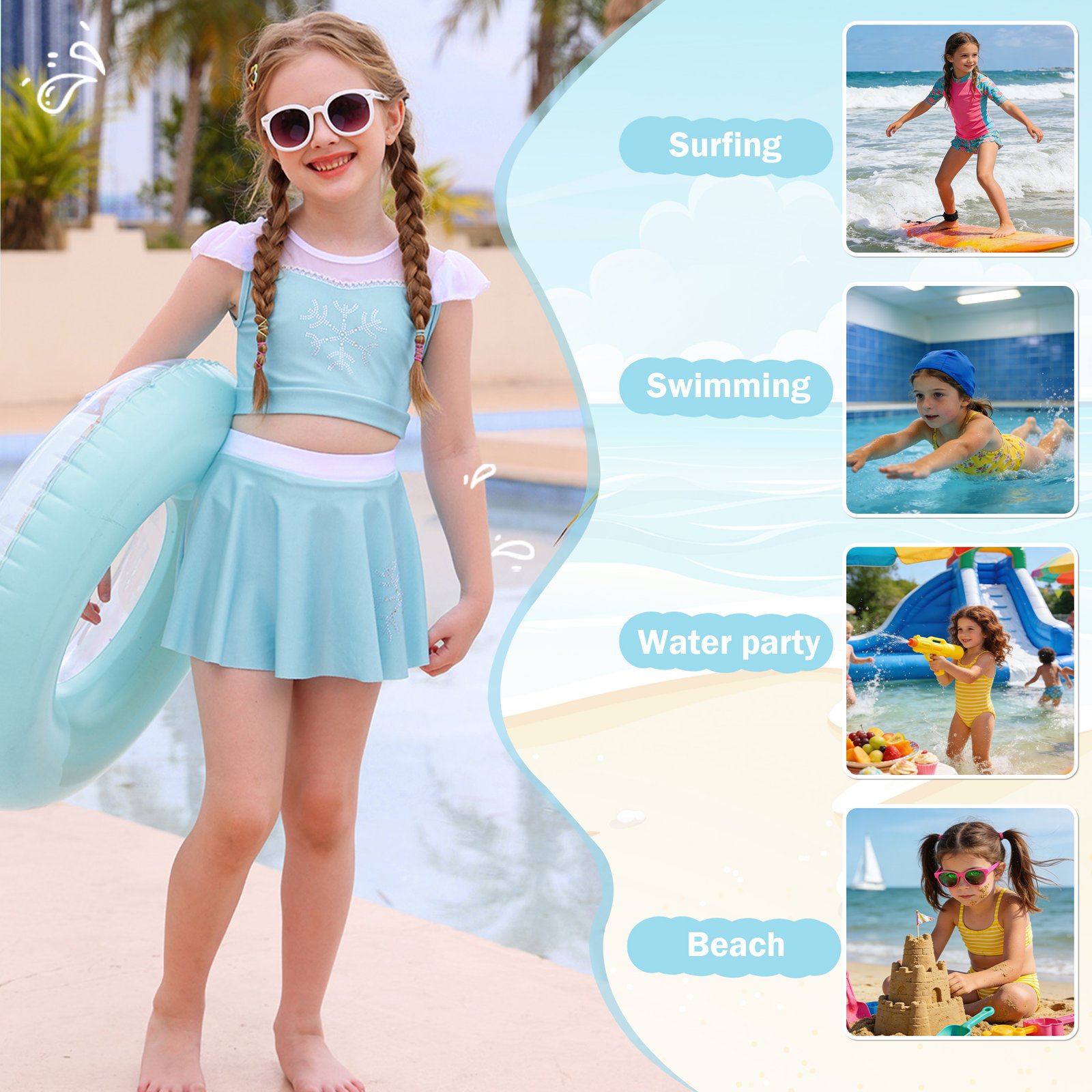Girls Elsa Bikinis Lovely ruffles off shoulder tankinis with shoulder straps allows your little girl to move freely. Shoulder straps can adjusted in length. And there is a adorable bow on the swimming skirt.