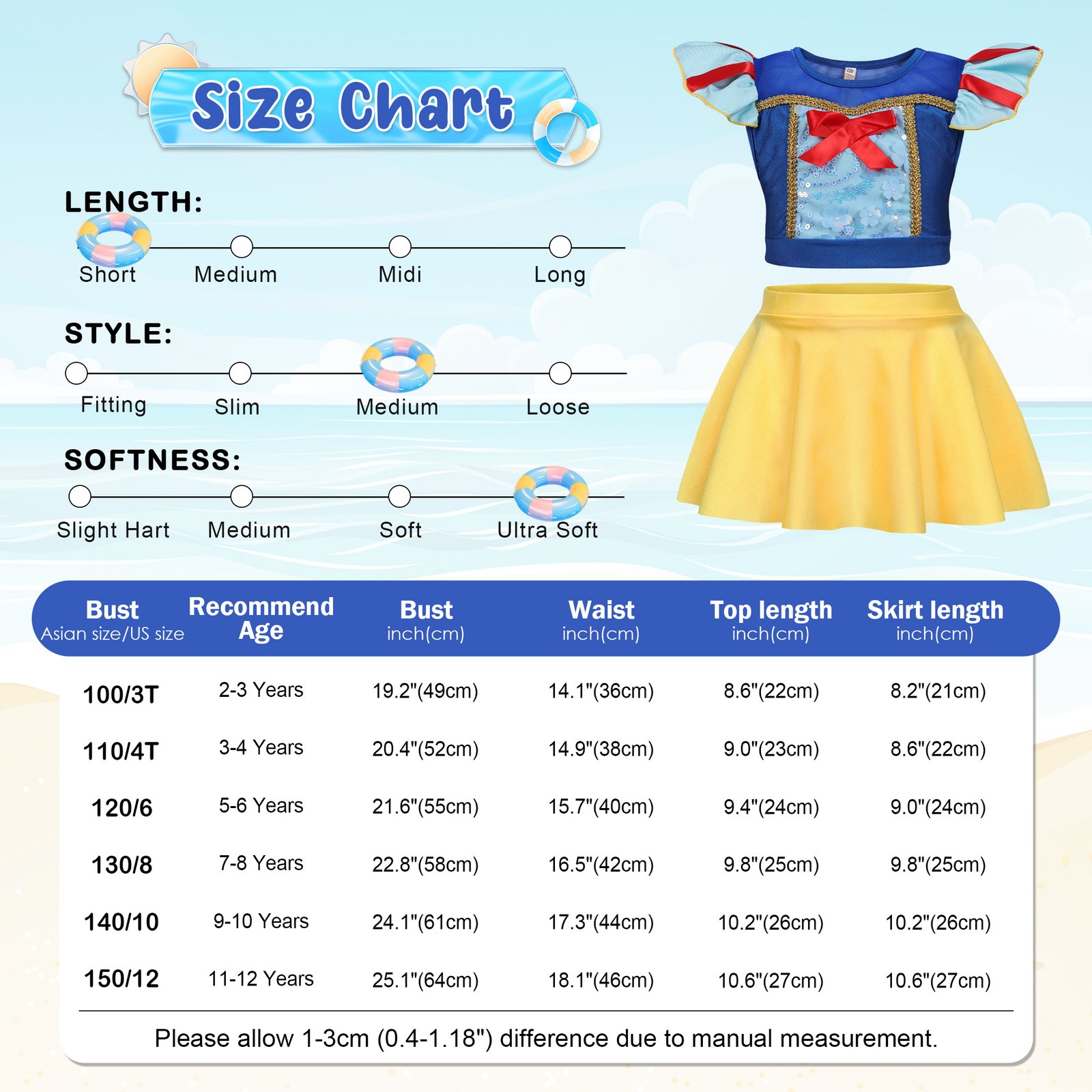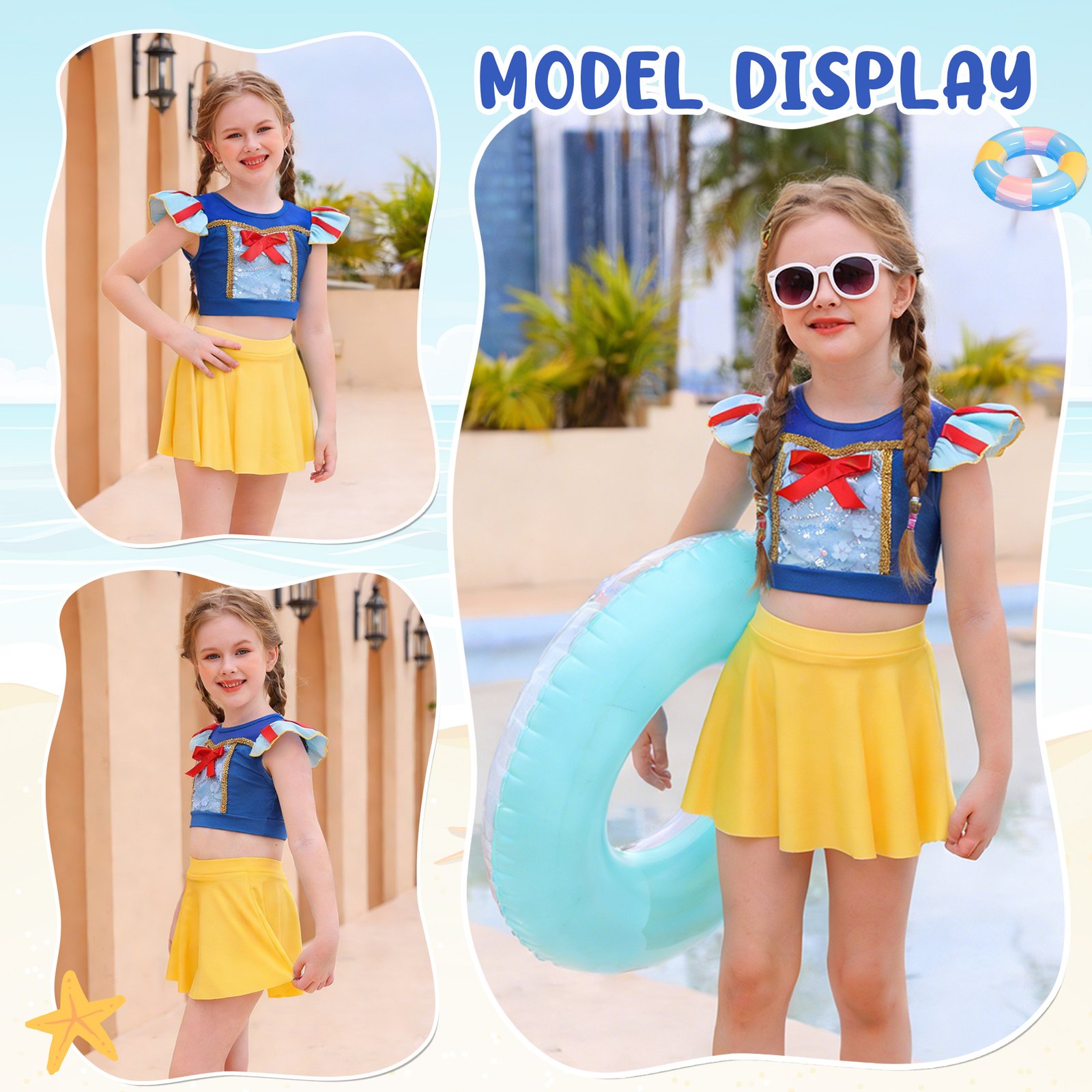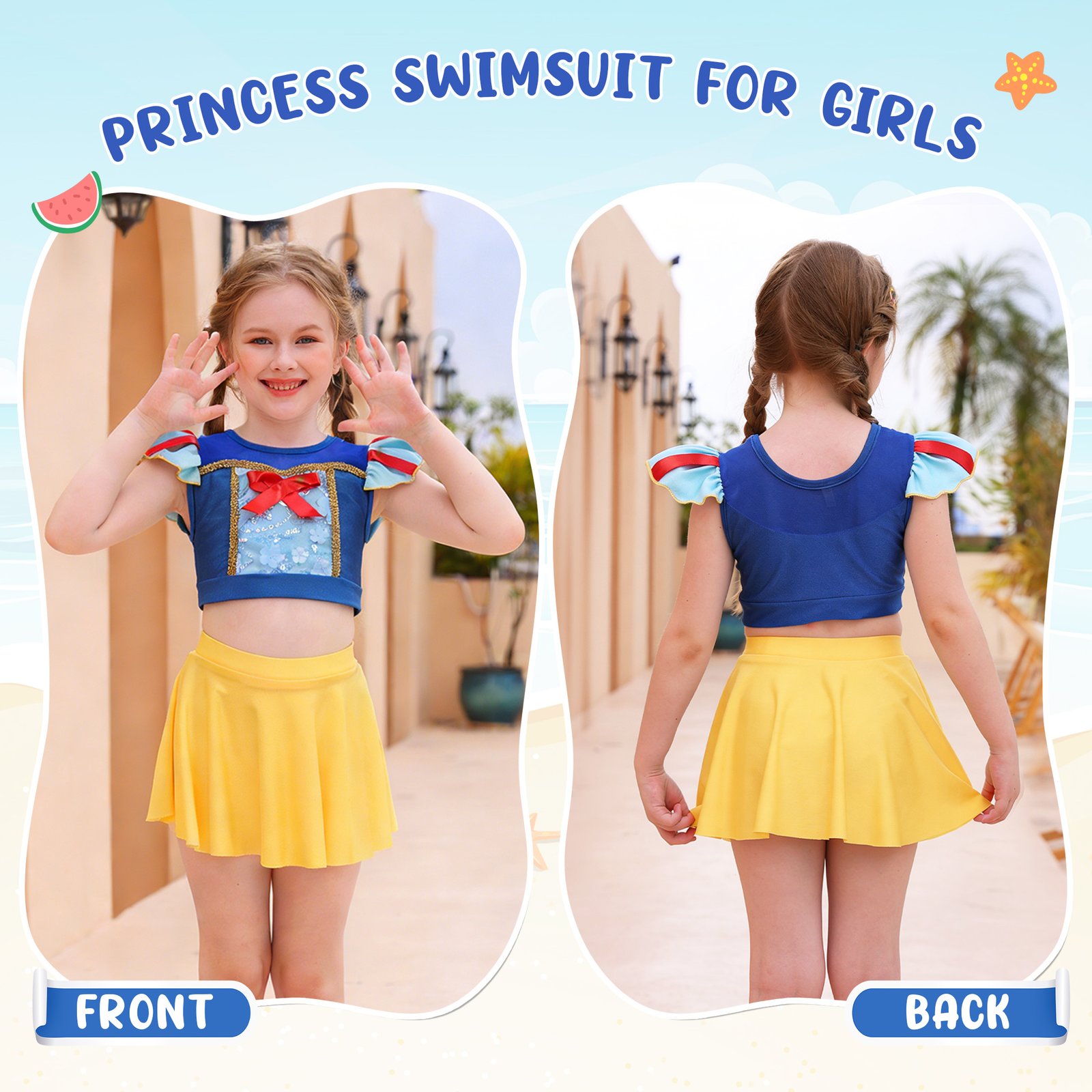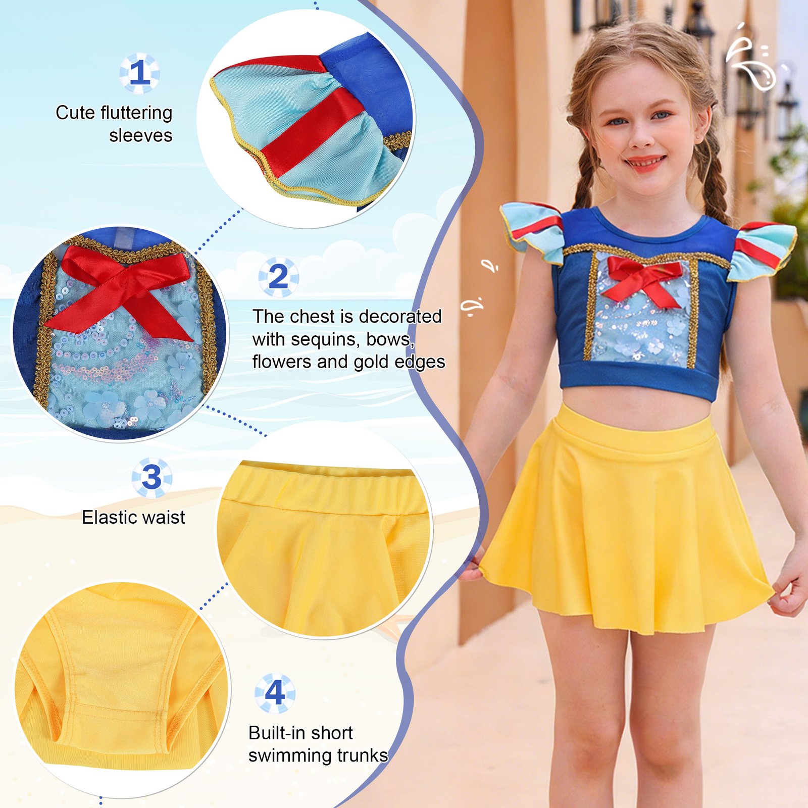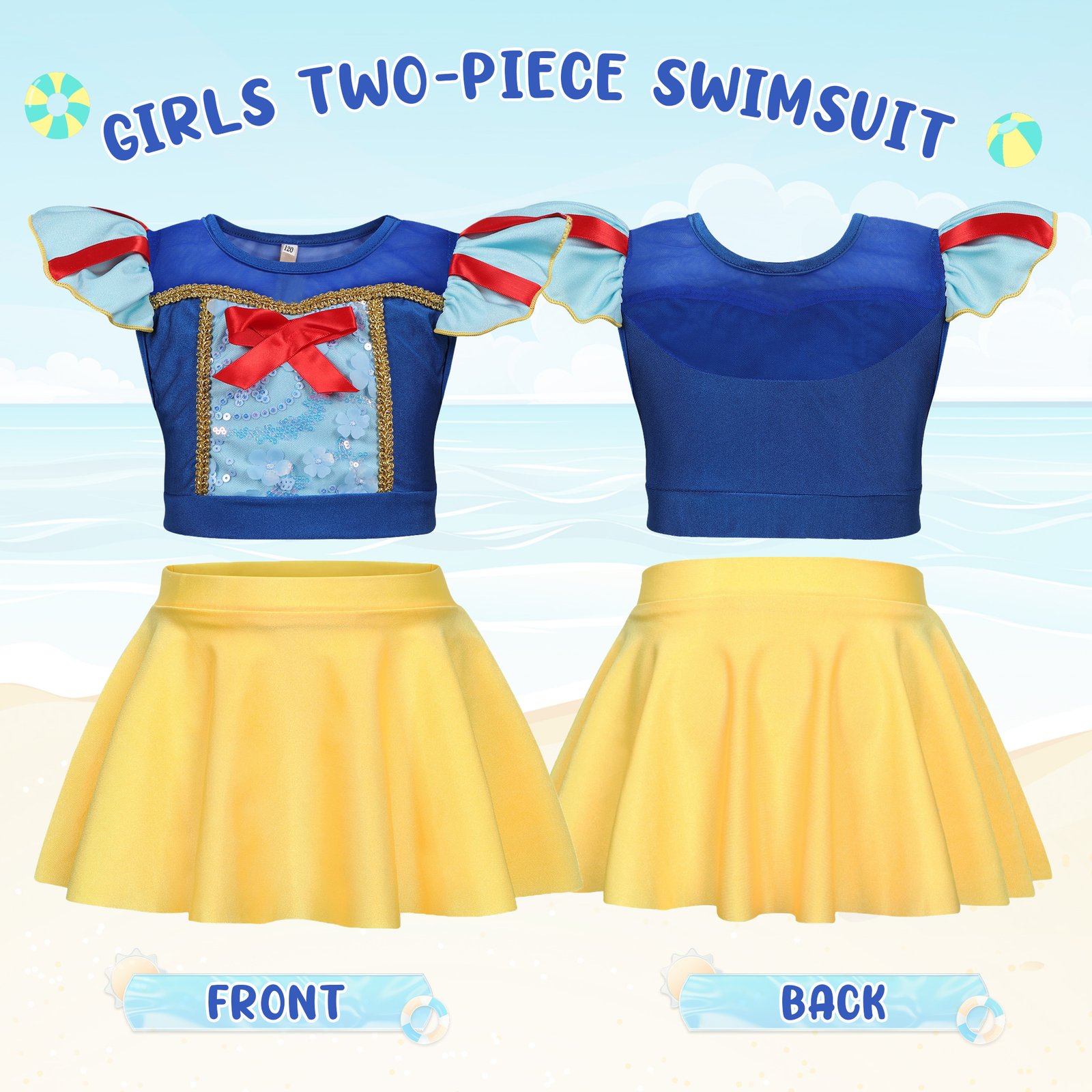 Great Snow White princess two-piece Bikinis swimsuit for summer and beach.Package includes:1 swimsuit top+1 skirts;