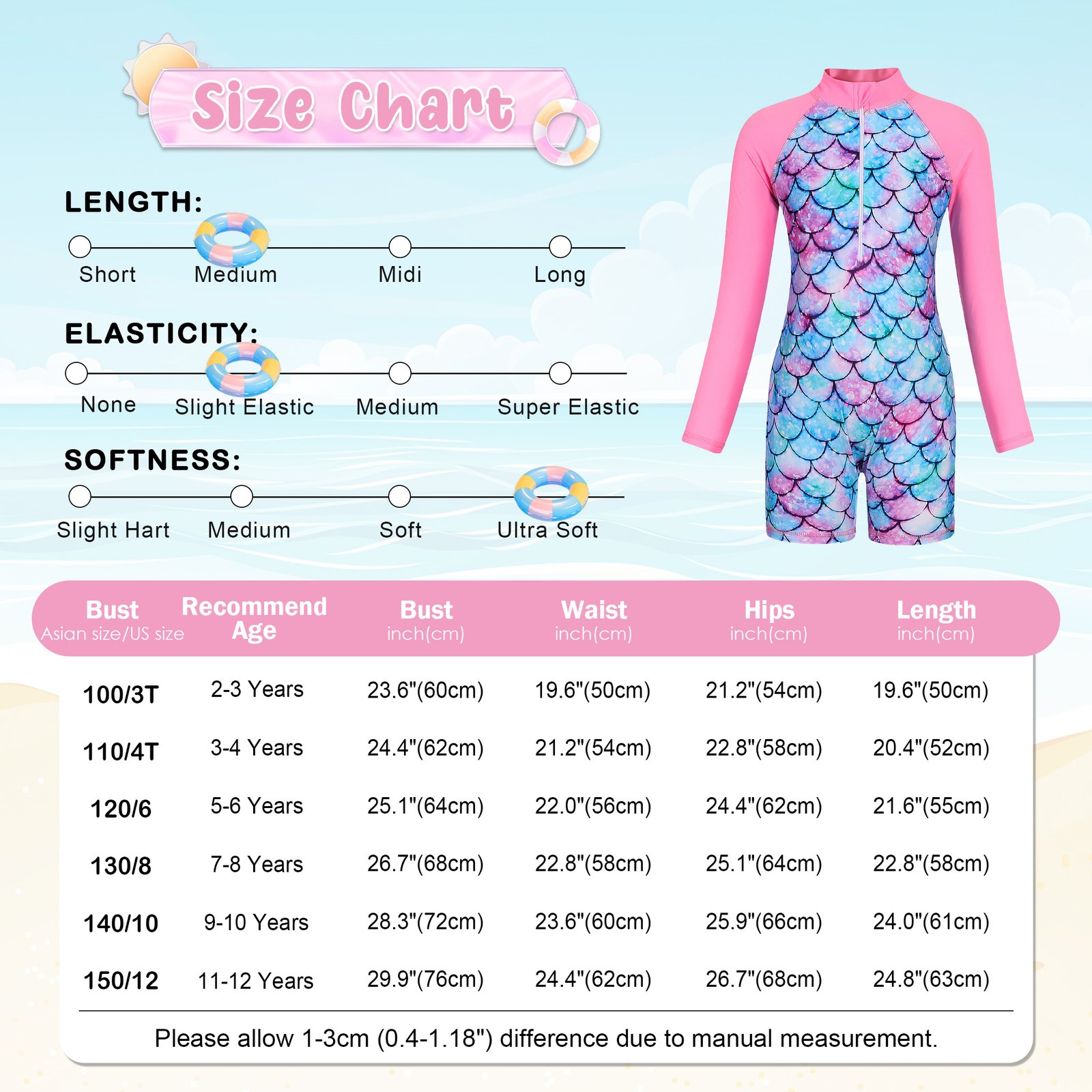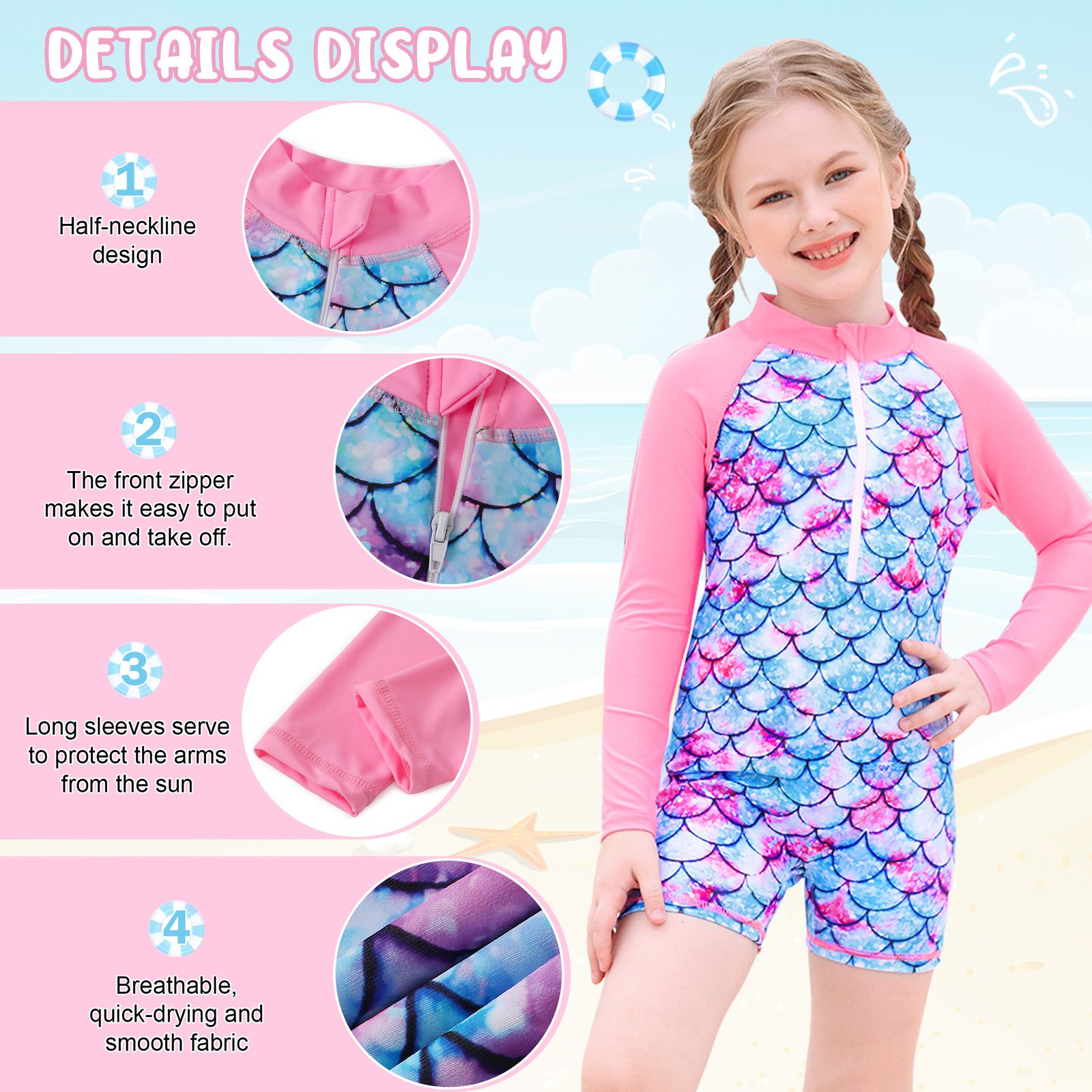 Convenient Zipper: The front zip makes it easy to put on and take off, reducing discomfort for kids and enabling quick changes between swimsuits.