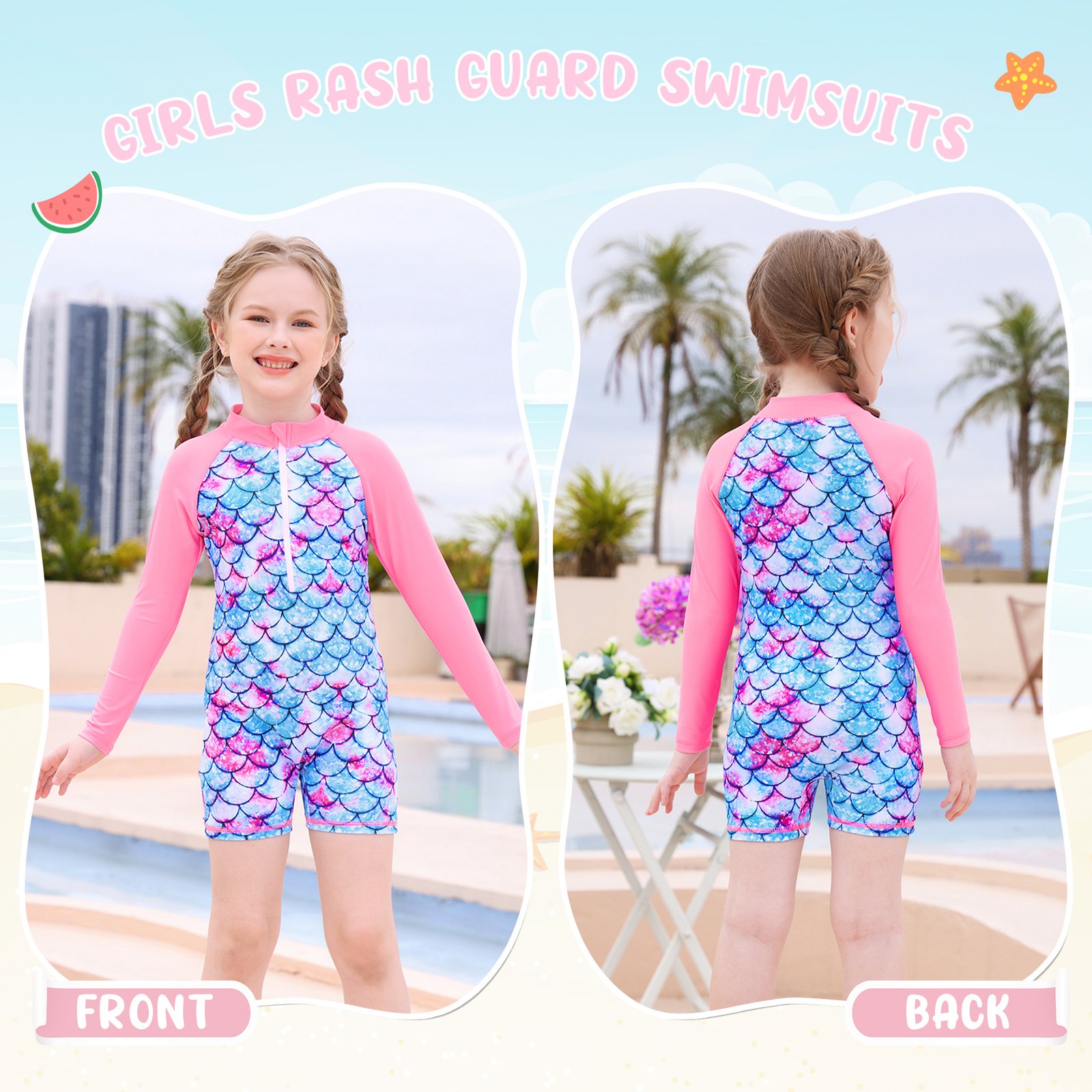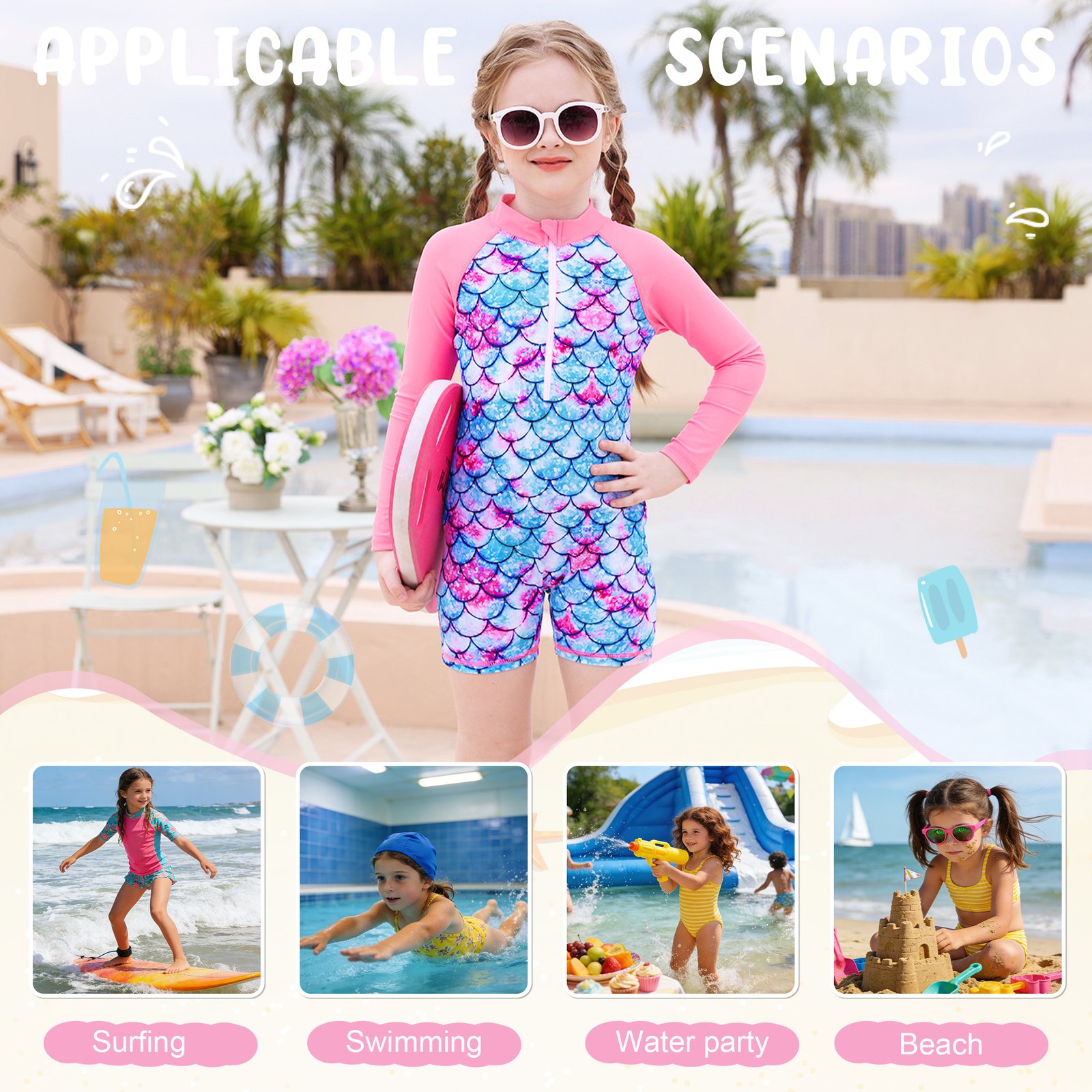 Sun Protection: Ariel Swimsuits The long-sleeve rash guard swimsuits effectively shields the skin from harmful UV rays, allowing your little princess to play freely in the sun.