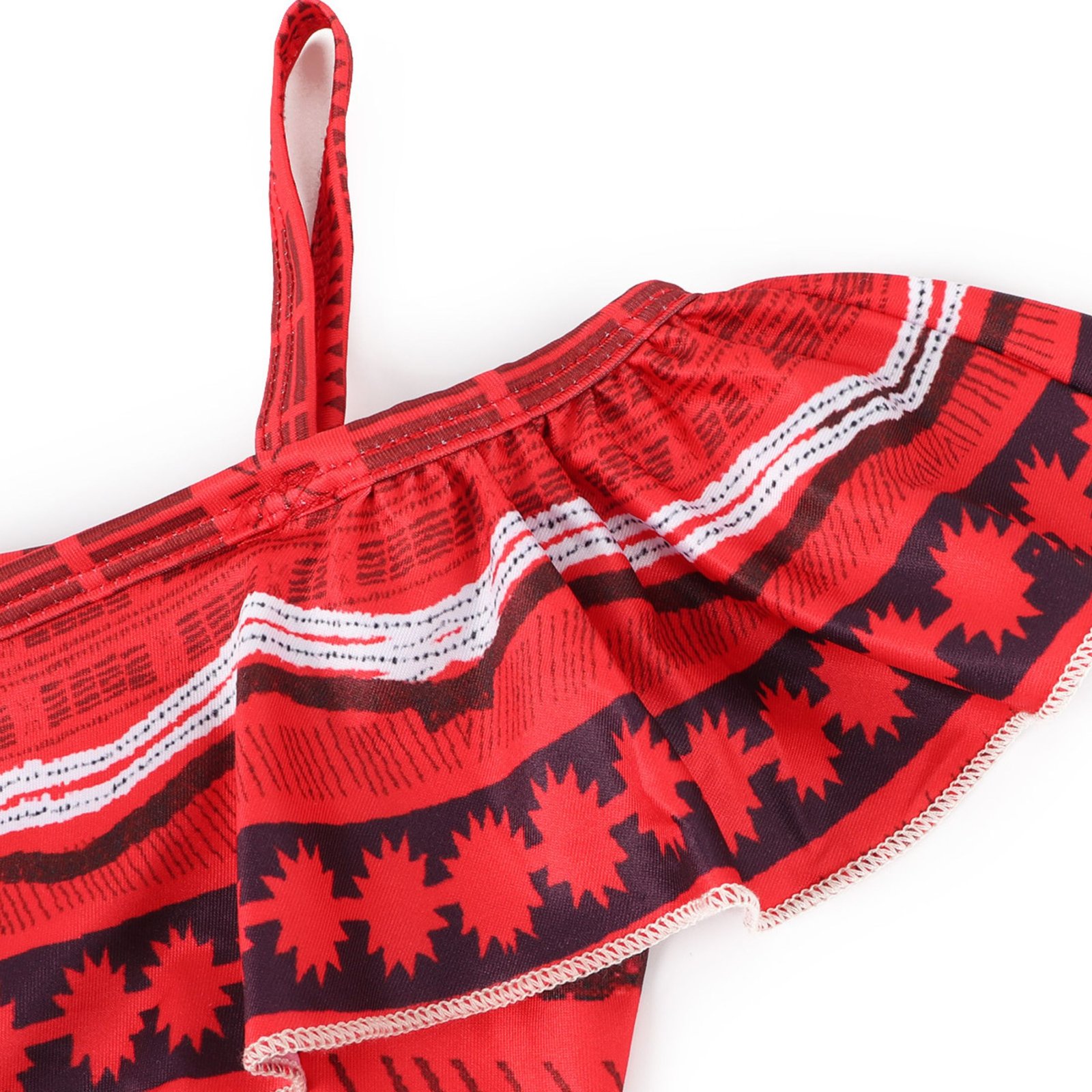 Lovely ruffles off shoulder tankinis with shoulder straps allows your little girl to move freely. Shoulder straps can adjusted in length. And there is a adorable bow on the swimming skirt.
